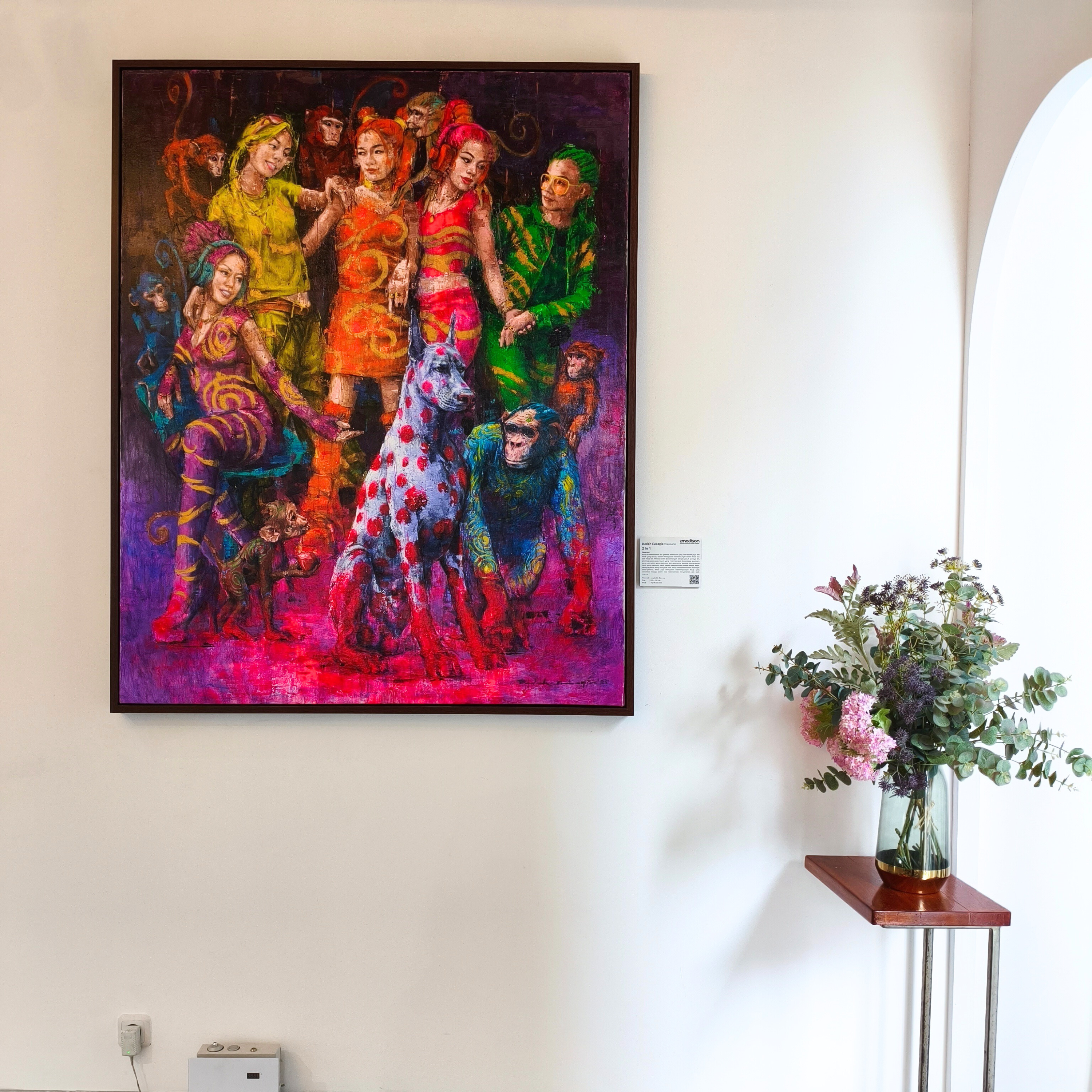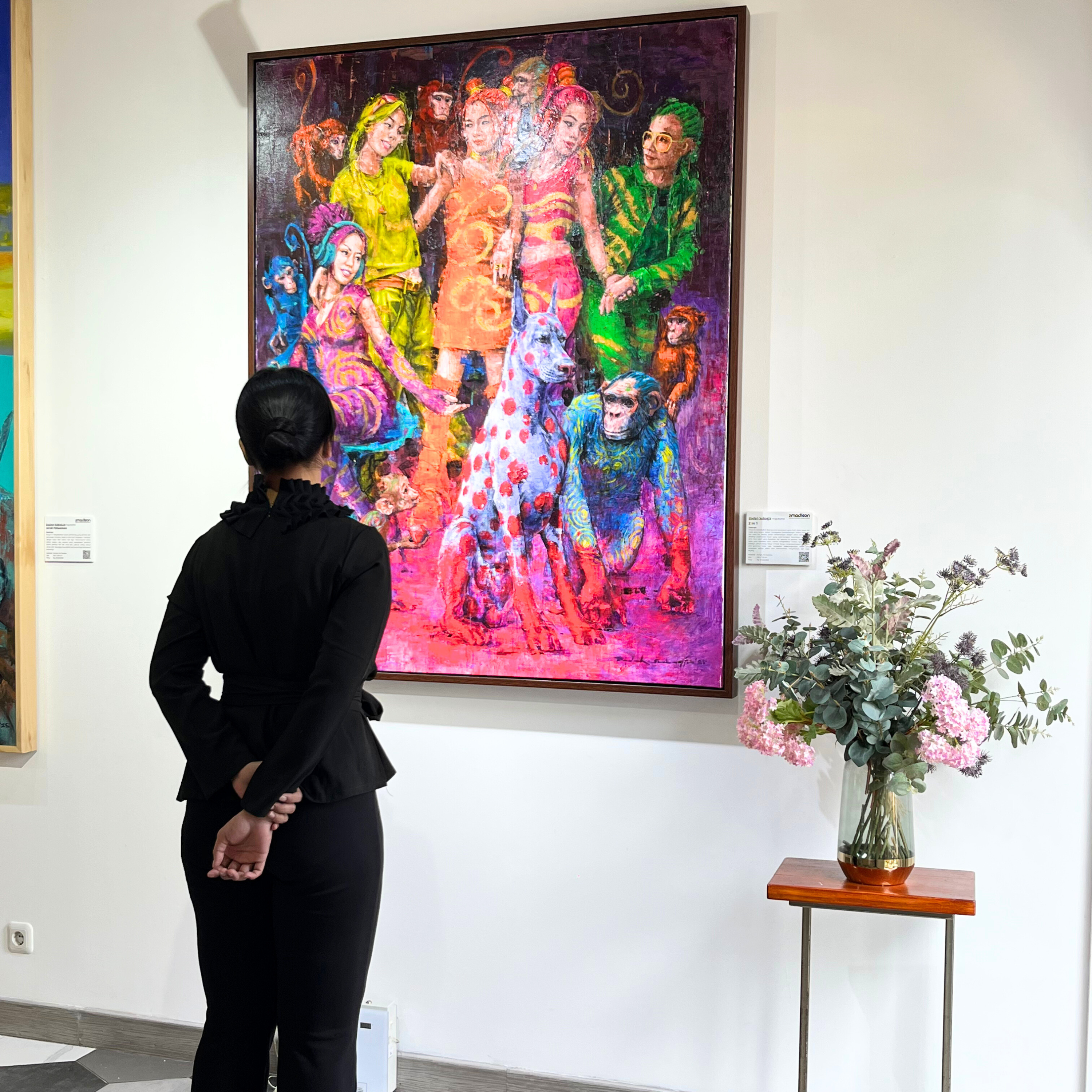 Karya ini menampilkan dua generasi perempuan yang hadir dalam gaya dan mode yang serupa, seakan menegaskan kesinambungan antara masa lalu dan masa kini. Mereka berdiri berdampingan dengan penuh percaya diri, dikelilingi sosok-sosok hewan yang melambangkan kecerdasan, kesetiaan, serta naluri alami yang diwariskan dari generasi ke generasi. Warna-warna cerah yang membalut tubuh mereka menghadirkan nuansa hangat, indah, sekaligus penuh energi. Karya ini tidak hanya merepresentasikan hubungan antar-generasi, tetapi juga merayakan keberlangsungan hidup yang senantiasa terjaga dalam rasa kebersamaan, kenyamanan, dan kasih sayang.