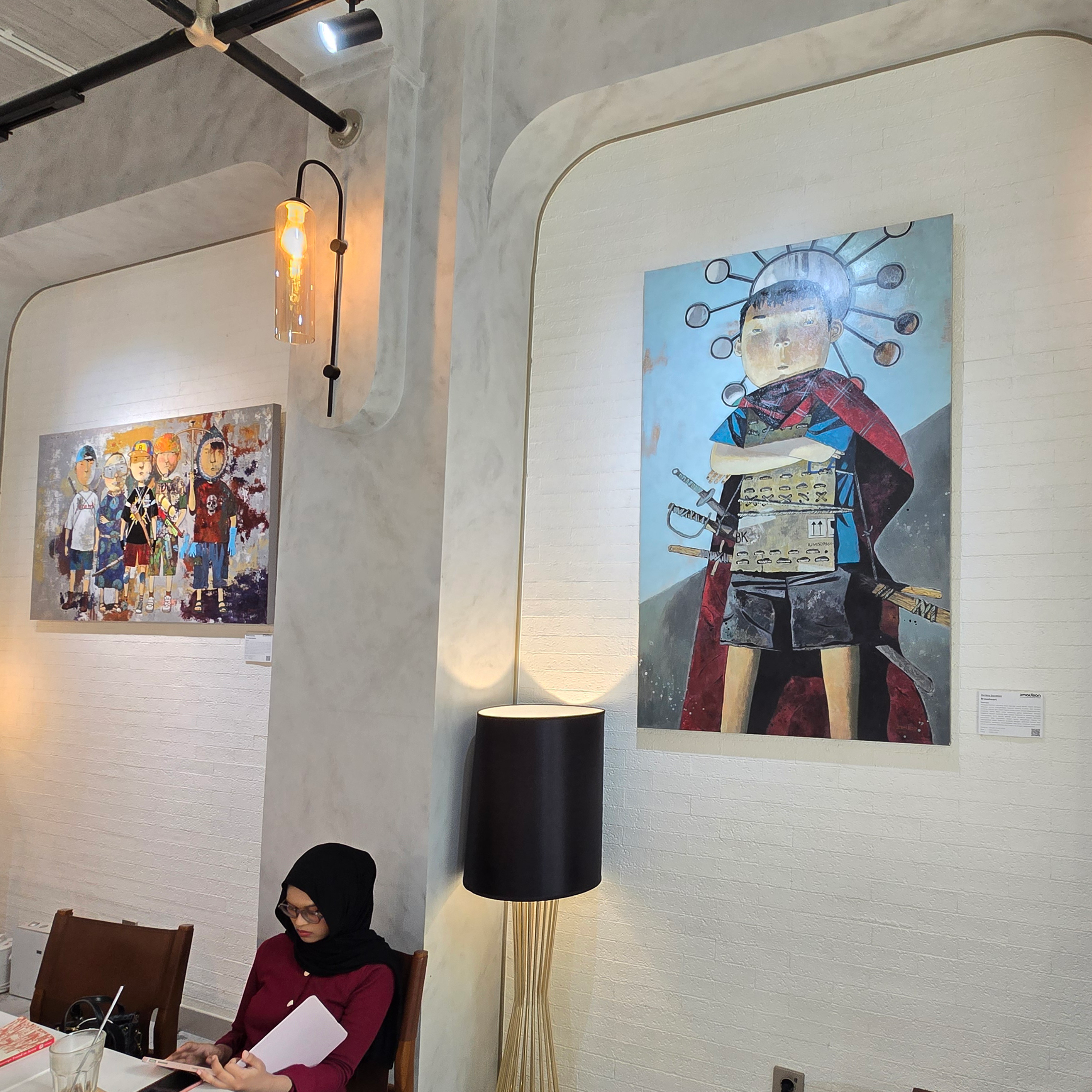 Menggambarkan seorang anak laki-laki yang berdiri tegak dengan ekspresi serius, mengenakan kostum ksatria buatan dari kardus, pedang mainan, dan jubah merah kotak-kotak simbol keberanian dan imajinasi masa kecil. Latar belakang yang sederhana dengan lingkaran seperti mahkota atau simbol matahari di belakang kepala menciptakan aura heroik, seolah anak tersebut adalah seorang pemimpin atau pahlawan dalam dunia khayalnya. Karya ini memadukan gaya realisme simbolik dengan sentuhan humor dan kehangatan, sekaligus merefleksikan kekuatan imajinasi anak-anak untuk menciptakan identitas dan makna di tengah keterbatasan.