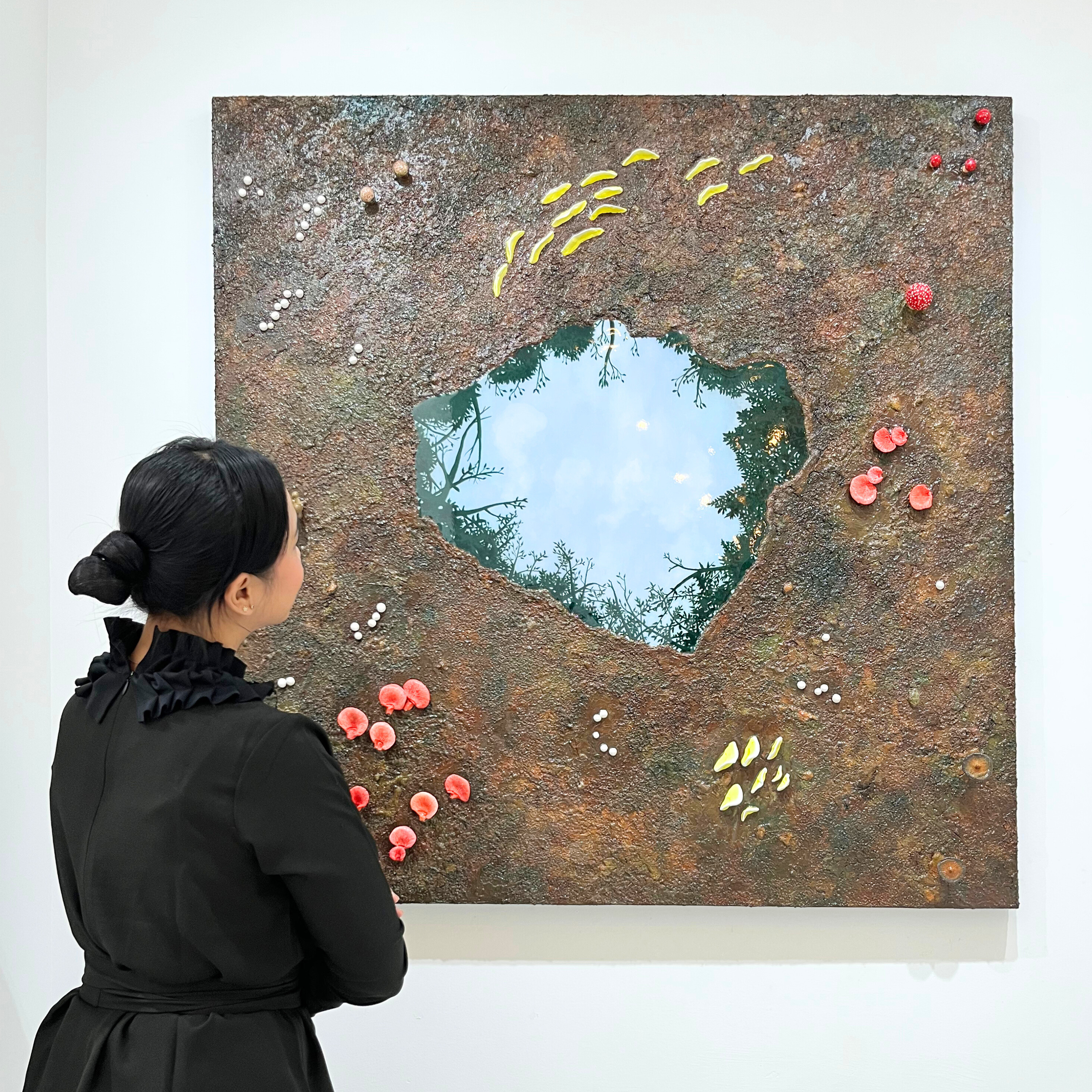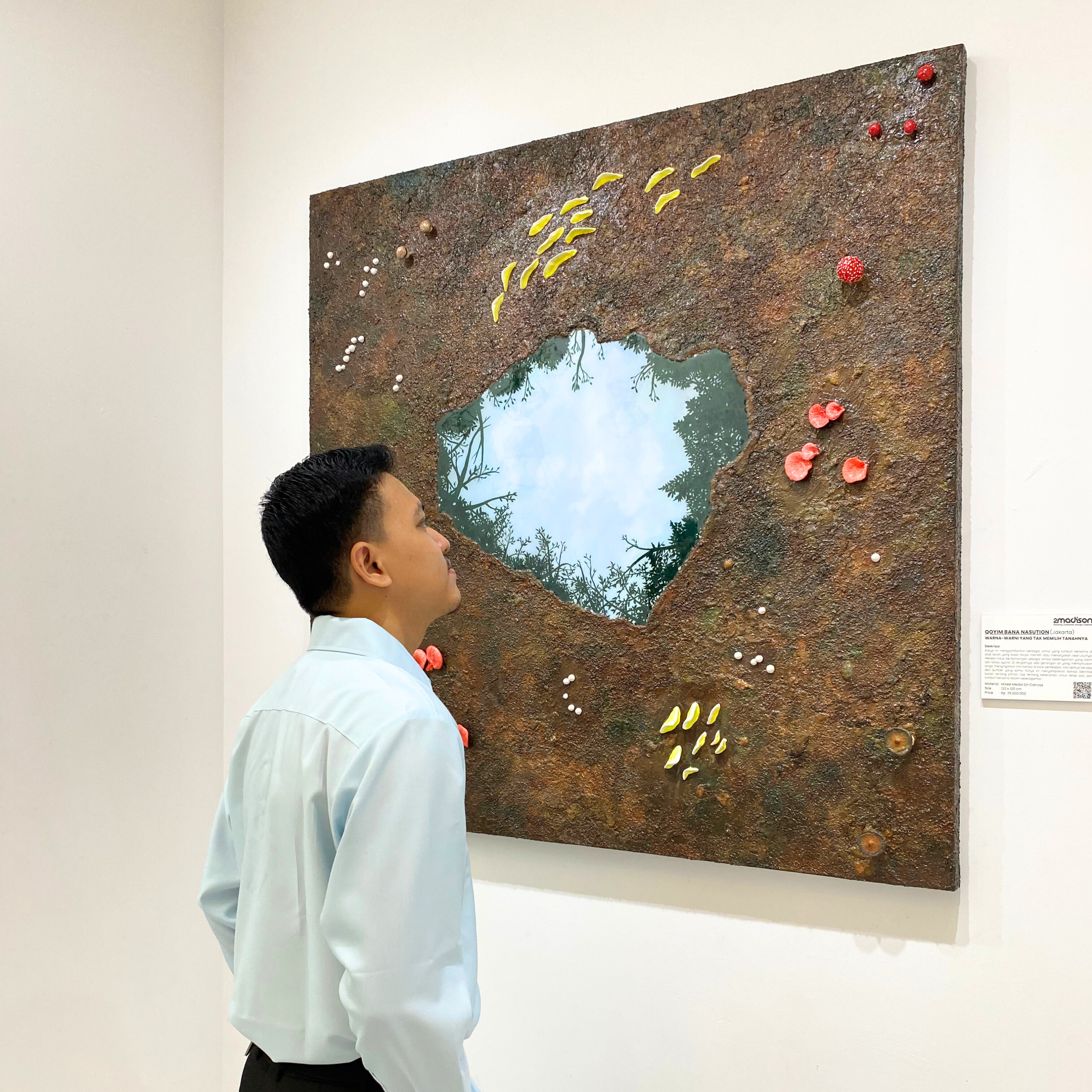 Karya ini menggambarkan berbagai jamur yang tumbuh bersama di atas tanah yang kasar tanpa memilih atau menanyakan asal-usulnya. Mereka hidup berdampingan sebagai simbol keberagaman yang alami dan tanpa syarat. Di tengahnya, ada genangan air yang memantulkan langit, mengingatkan kita bahwa di balik perbedaan, kita semua berasal dari sumber yang sama. Karya ini menyampaikan bahwa identitas bukan tentang pilihan, tapi tentang keberanian untuk tetap ada dan tumbuh bersama dalam keberagaman.
