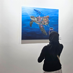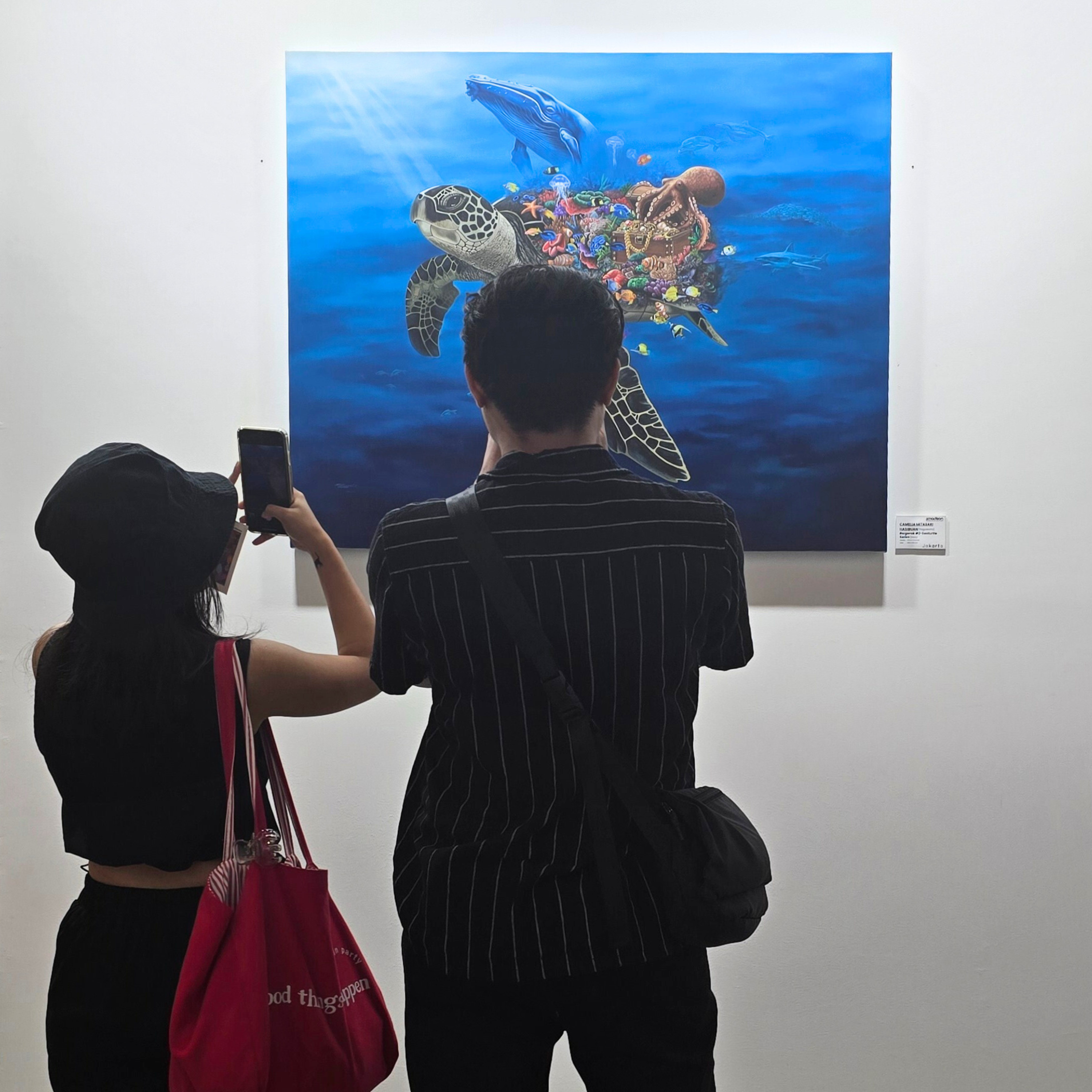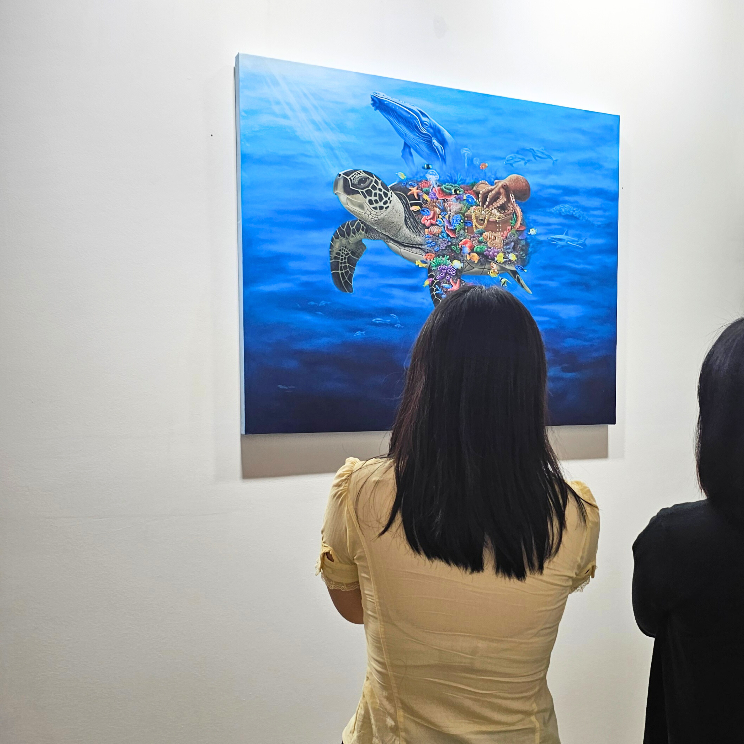 Karya ini menampilkan penyu sebagai simbol ketangguhan dan pelindung kehidupan laut. Di atas cangkangnya, ia membawa terumbu karang, biota laut, dan peti harta karun, melambangkan kekayaan dan pentingnya ekosistem laut. Dengan berenang melawan arus, penyu digambarkan sebagai penjaga yang membawa kehidupan menuju tempat yang lebih aman, diikuti makhluk laut lain yang juga mencari kedamaian.
