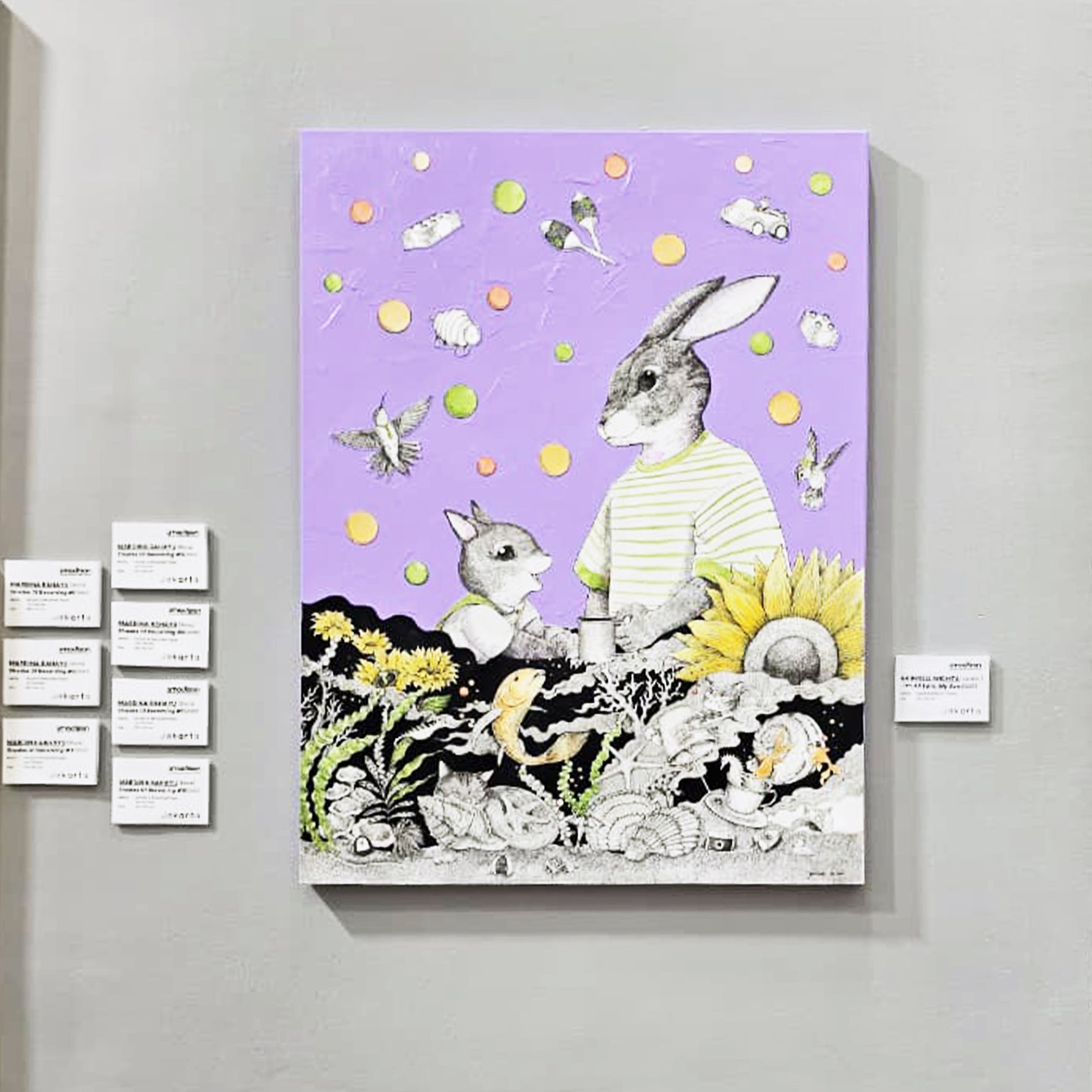 The artwork “I’m All Ears, My Son” is inspired by a daily moment between the artist’s husband and child, as they make babychino and share light conversations. Both figures are depicted as rabbits, reflecting their Chinese zodiac signs, surrounded by toys and the child’s favorite objects. This piece captures the warmth of the father-child bond that grows from simple everyday togetherness.