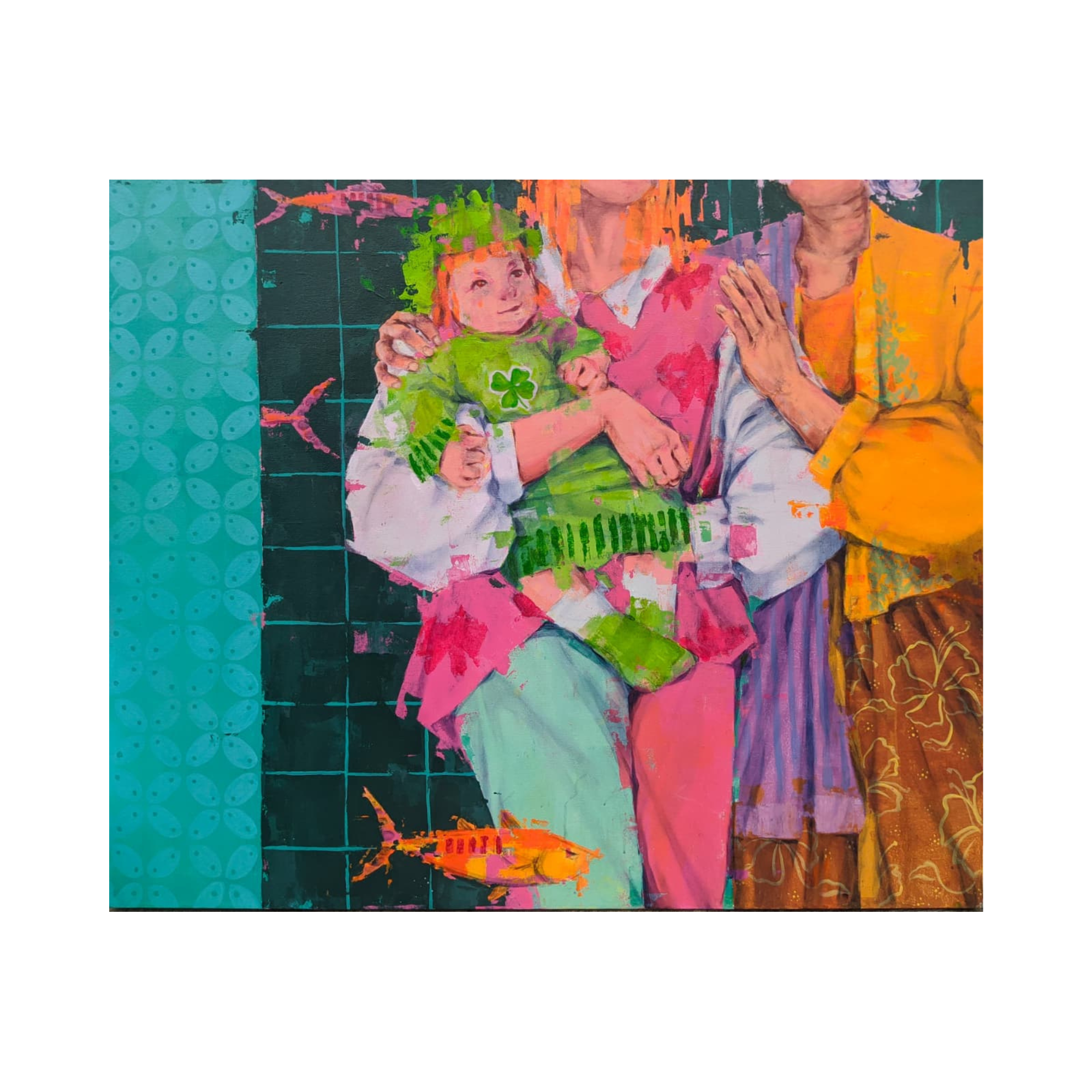 Lukisan ini menggambarkan ikatan kasih sayang yang abadi antara ibu dan anak, sebagai garis emosional yang tak pernah putus, bahkan ketika seorang anak telah menjadi ibu. Melalui sosok tiga generasi perempuan yaitu anak, ibu, dan nenek, lukisan ini menyampaikan bahwa menjadi ibu tidak menghilangkan kebutuhan akan dukungan seorang ibu. Warna-warna cerah dan simbol-simbol seperti ikan serta pola latar memberikan nuansa hangat, dinamis, dan penuh makna tentang kehidupan yang terus bergerak. Karya ini adalah pengingat bahwa di balik peran dan kekuatan seorang ibu, tetap ada ruang untuk dirangkul, dicintai, dan dikuatkan oleh ibu lainnya.