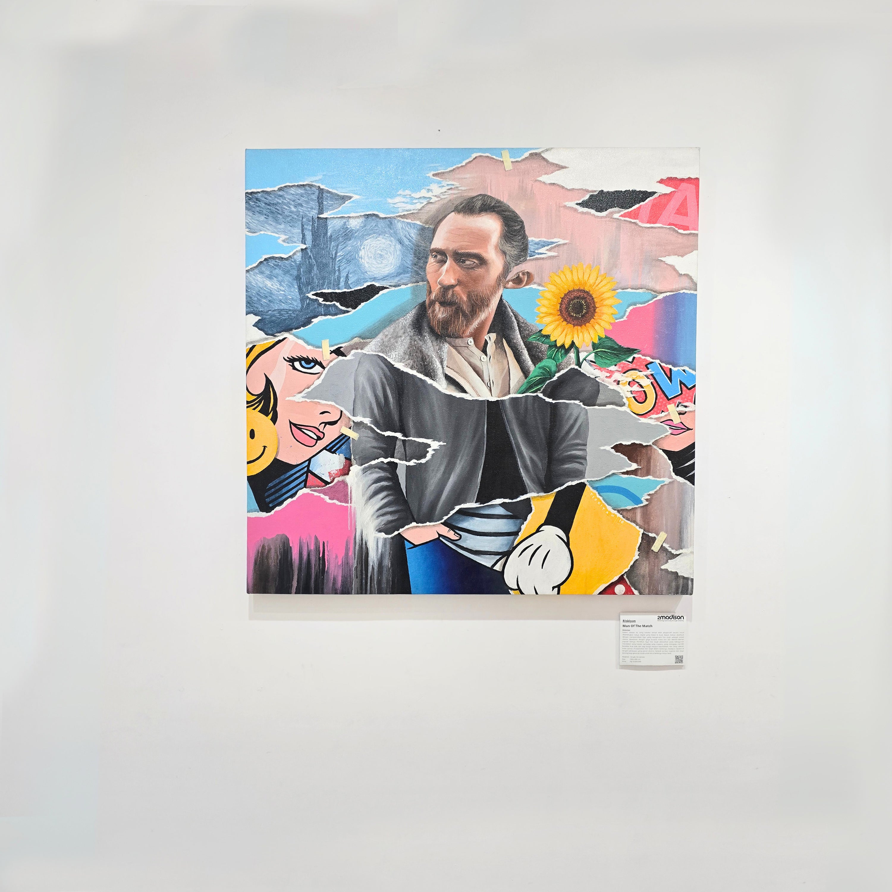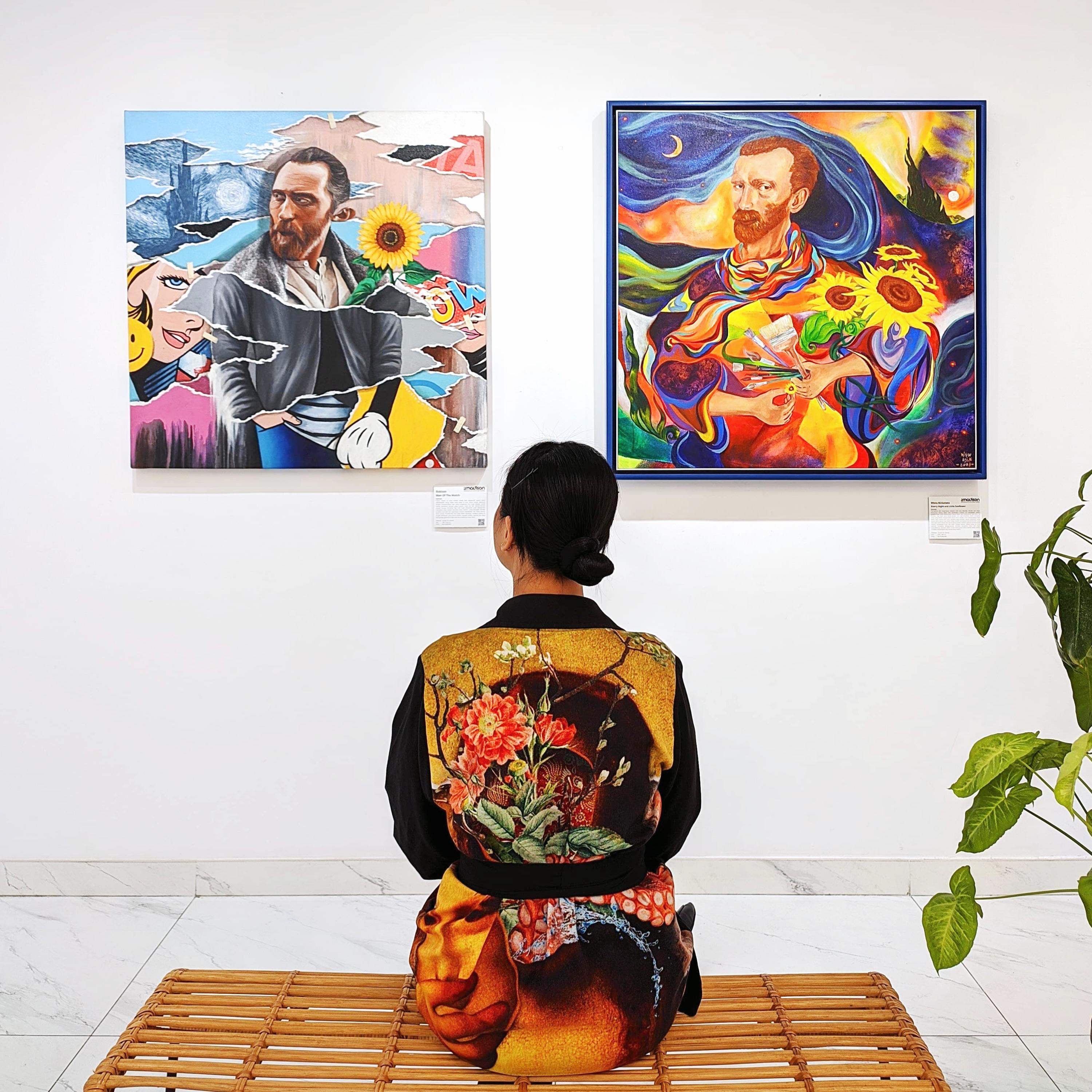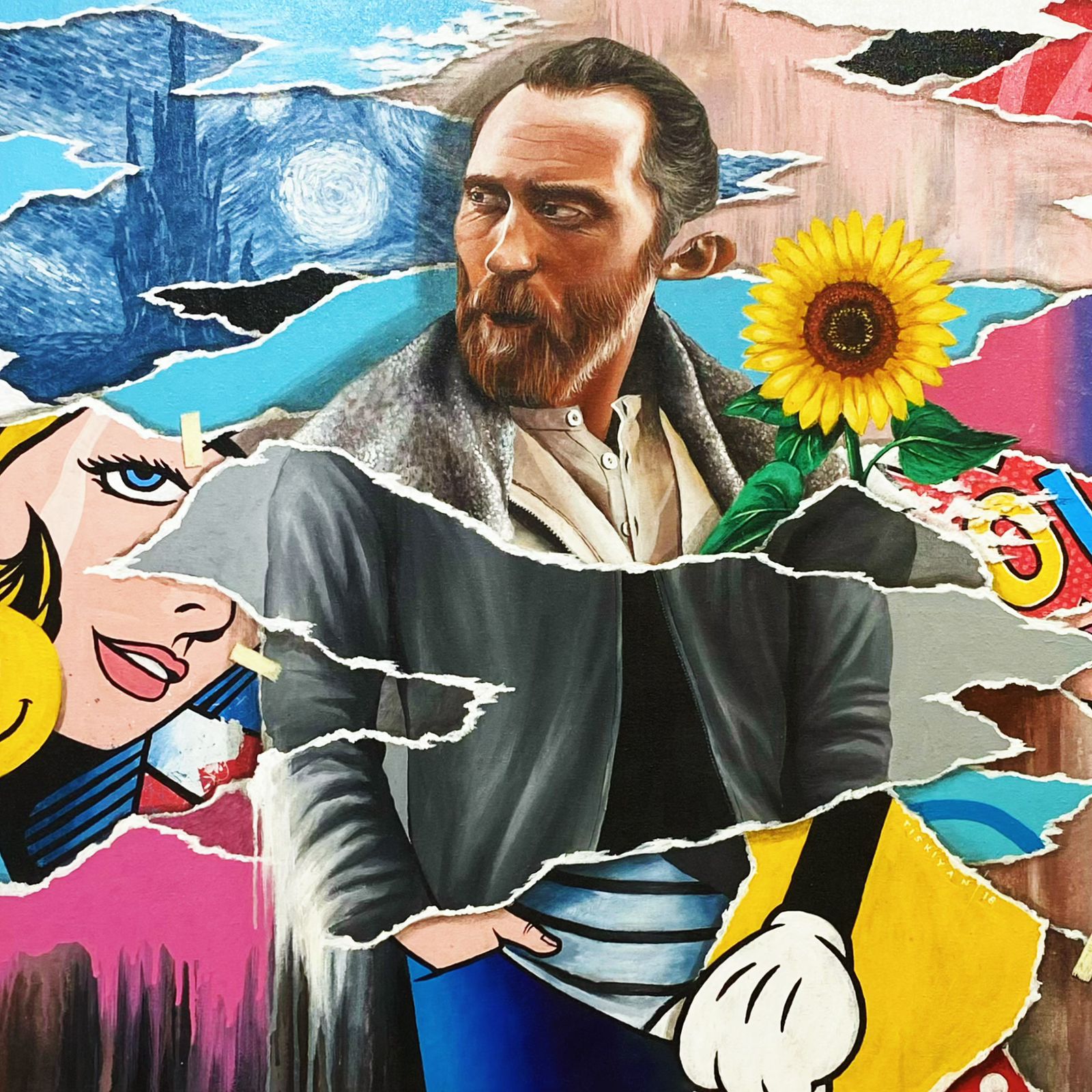 In this painting, the creator explores visual expression more boldly than in his usual digital works. The collage-like impression is enhanced by parodying a figure resembling Van Gogh as the main subject, combined with contemporary fashion styles and other popular elements. The choice of Van Gogh as a figure is based on the creator’s deep admiration for the maestro, who is seen as having a strong character both in his artworks and personality and remains relevant across generations. Van Gogh’s productivity in creating art, despite living a life full of turmoil, serves as a source of inspiration and motivation for younger generations to keep creating without pause.