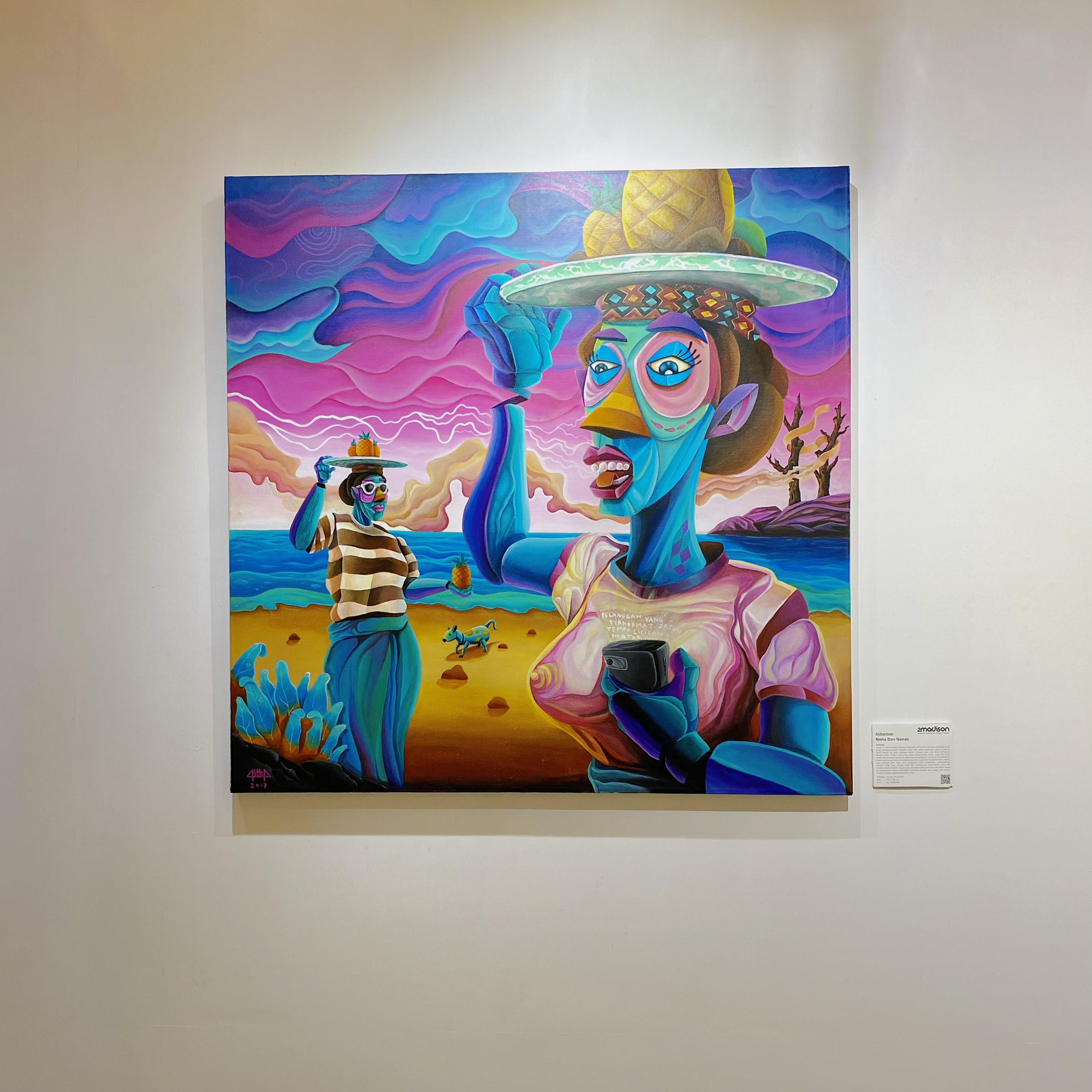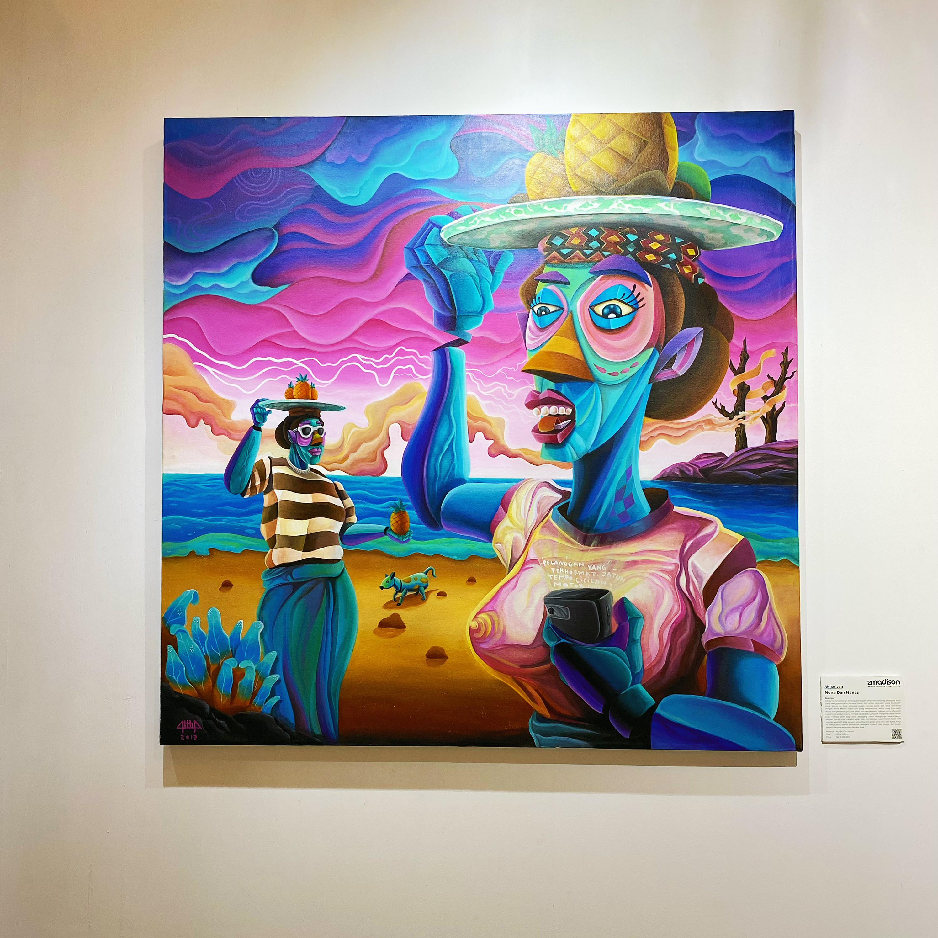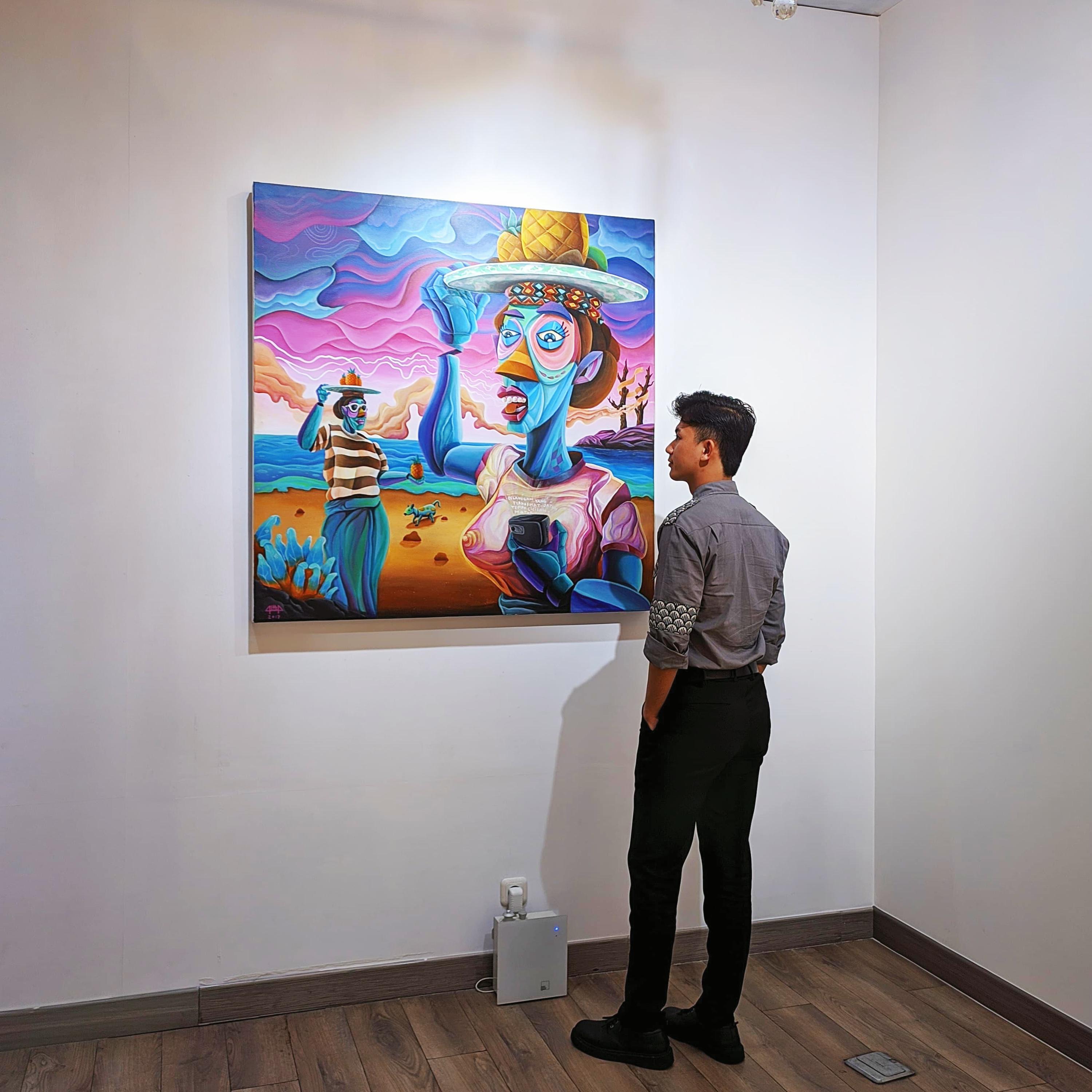 This artwork tells the story of a fruit vendor’s everyday life, where each sale carries a hope for a vacation to the city, to pay off debts, to top up phone credit, and to stay connected to the world. Dominated by the color blue, the same blue as a fifty-thousand-rupiah bill and emotions too deep to express. The painting reflects how consumerism has become a new kind of addiction, one that knows no boundaries. Yet, through it, the vendor supports his children, nurturing a dream that they might one day build a fruit supermarket of their own. Behind the smile offered to Western visitors, the work suggests that civilization often begins at the edges by the shore, where simple hopes take root.