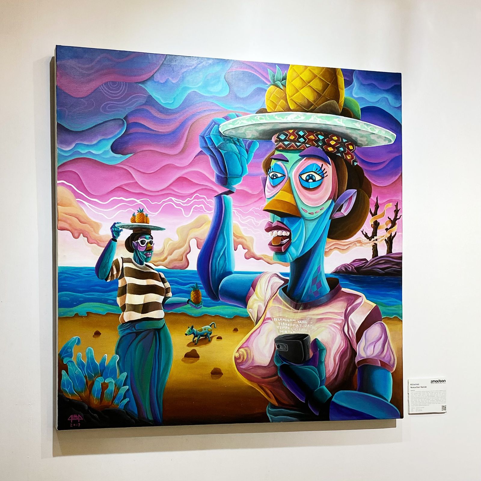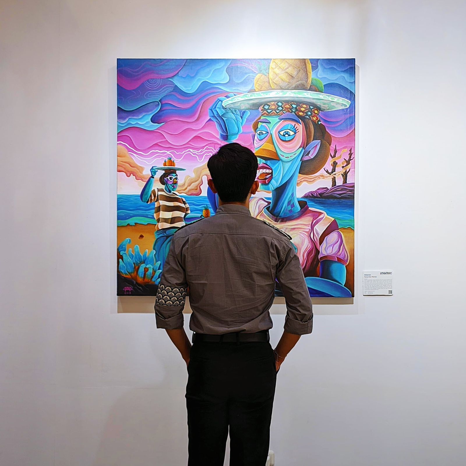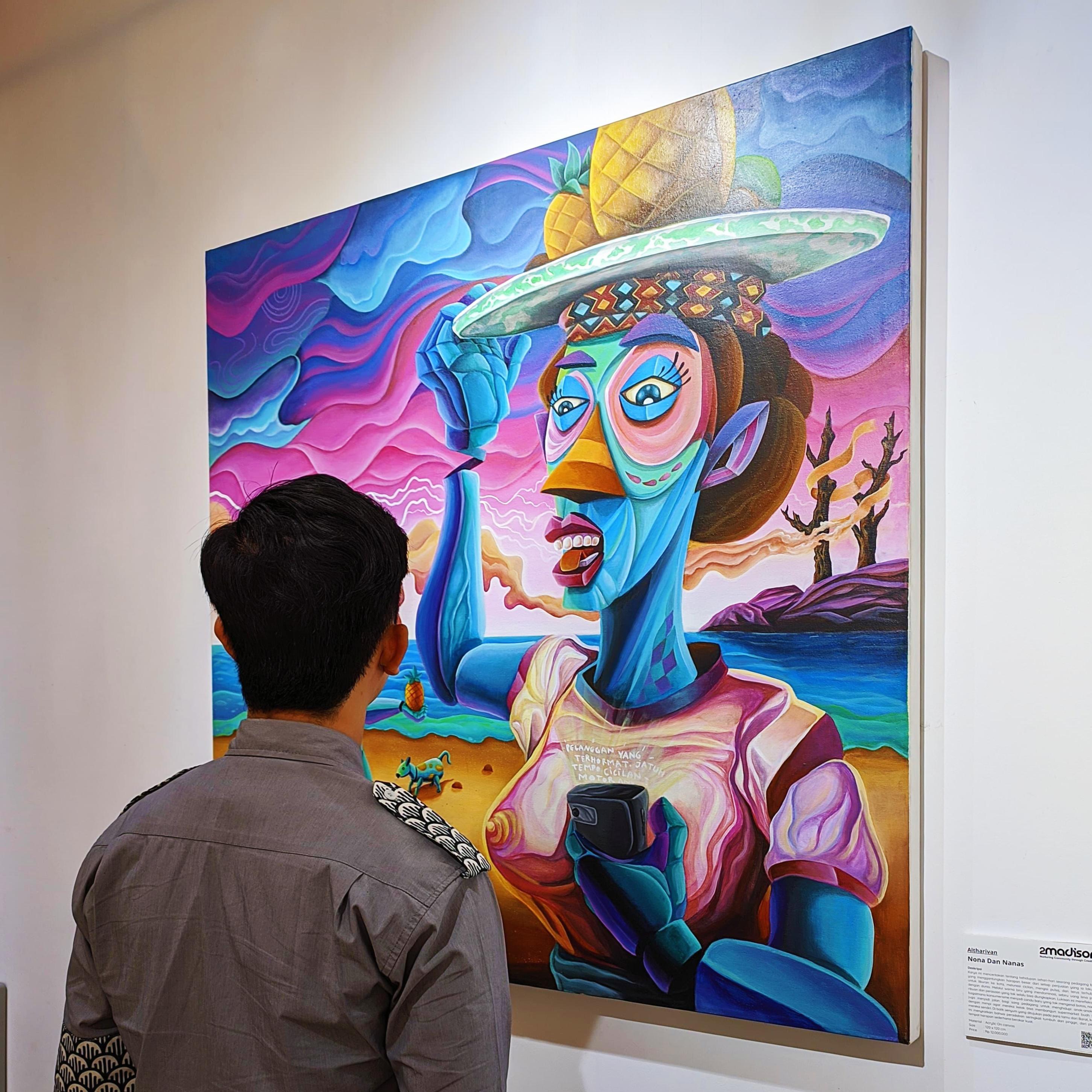 This artwork tells the story of a fruit vendor’s everyday life, where each sale carries a hope for a vacation to the city, to pay off debts, to top up phone credit, and to stay connected to the world. Dominated by the color blue, the same blue as a fifty-thousand-rupiah bill and emotions too deep to express. The painting reflects how consumerism has become a new kind of addiction, one that knows no boundaries. Yet, through it, the vendor supports his children, nurturing a dream that they might one day build a fruit supermarket of their own. Behind the smile offered to Western visitors, the work suggests that civilization often begins at the edges by the shore, where simple hopes take root.