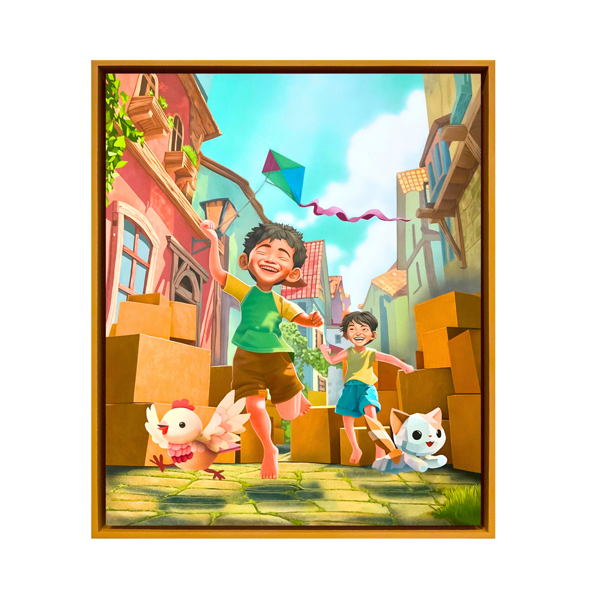 This artwork captures the simple yet meaningful joy of childhood, showing two children running happily down a narrow, light-filled street, accompanied by colorful kites dancing in the blue sky. Behind this happiness lies a philosophy about kites: although they fly high, they are never proud because they are always held by strings that keep them balanced and guided. Like kites, human happiness and achievements are always connected to love, support, and bonds that help us keep moving forward without losing our way.