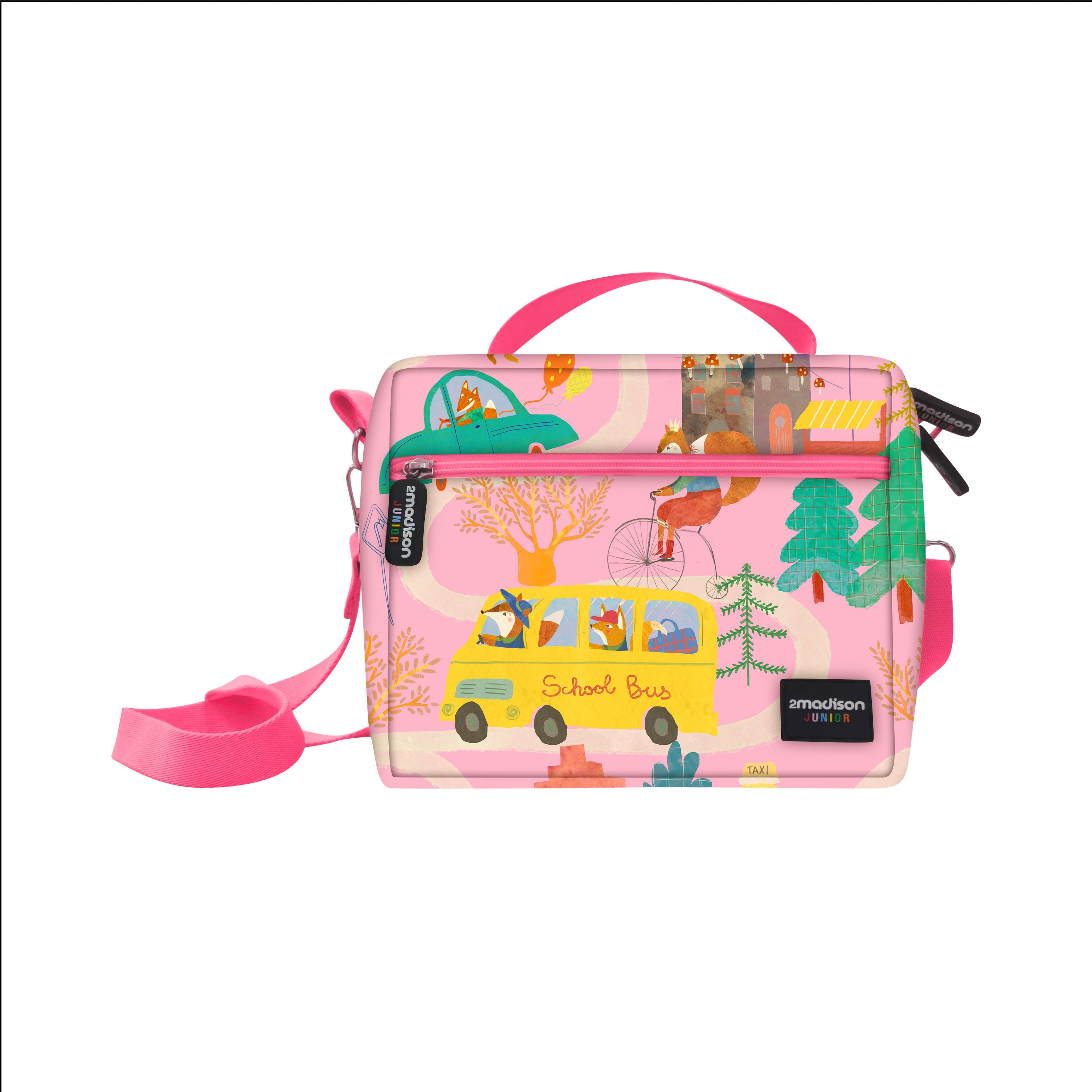 Dengan desain ceria bertema Going to School, tas ini menampilkan si rubah lucu yang berangkat sekolah naik bus dan singgah ke berbagai tempat seru seperti taman bermain hingga museum. Going to School in Pink Lunch Bag siap jadi teman setia si kecil dalam setiap petualangan makan siang mereka.