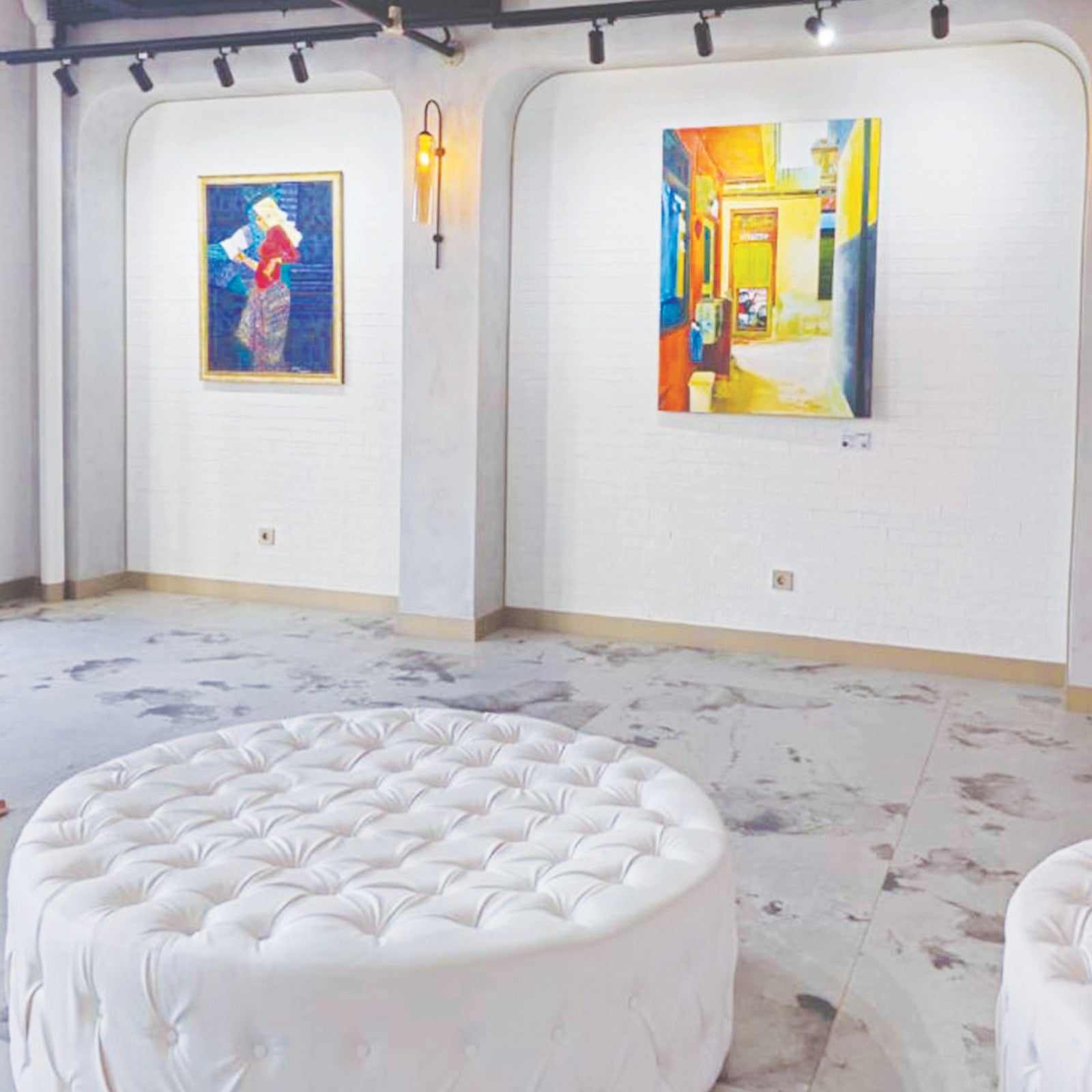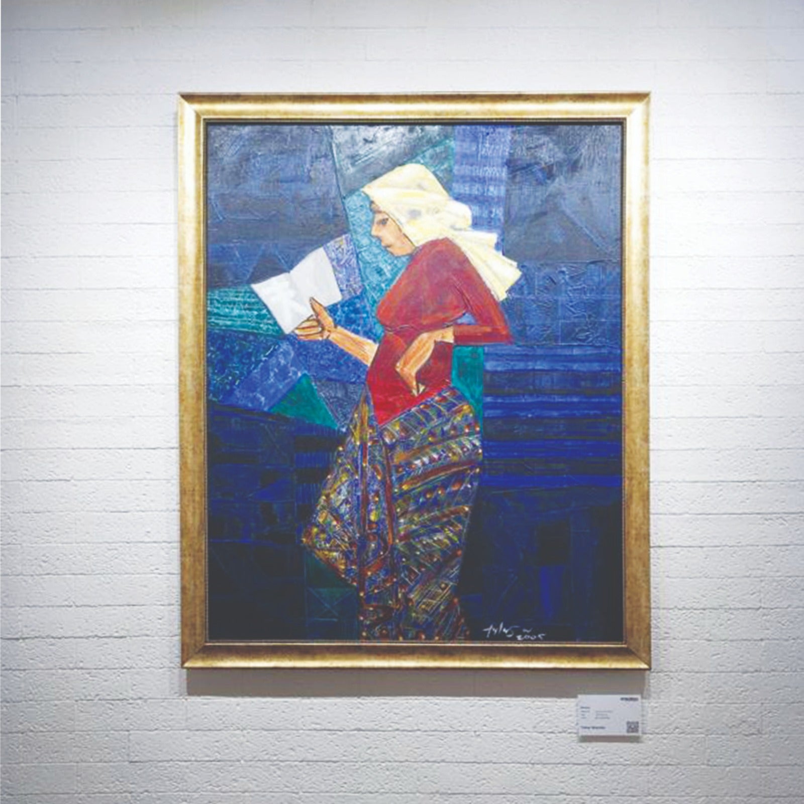 Menggambarkan sosok perempuan yang tengah membaca buku, dibalut busana tradisional dengan motif kaya warna. Gestur tubuhnya yang tenang dan penuh konsentrasi merefleksikan semangat pencarian ilmu di tengah identitas budaya yang kuat. Latar berwarna biru dan hijau bertekstur geometris memberi kesan dinamis namun tetap harmonis, memperkuat makna bahwa proses belajar adalah perjalanan batin yang menyatu dengan nilai-nilai tradisi.