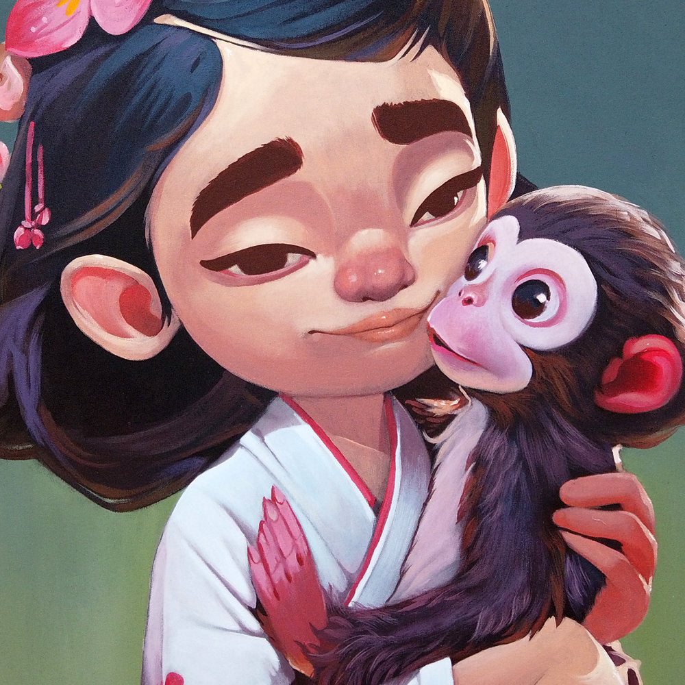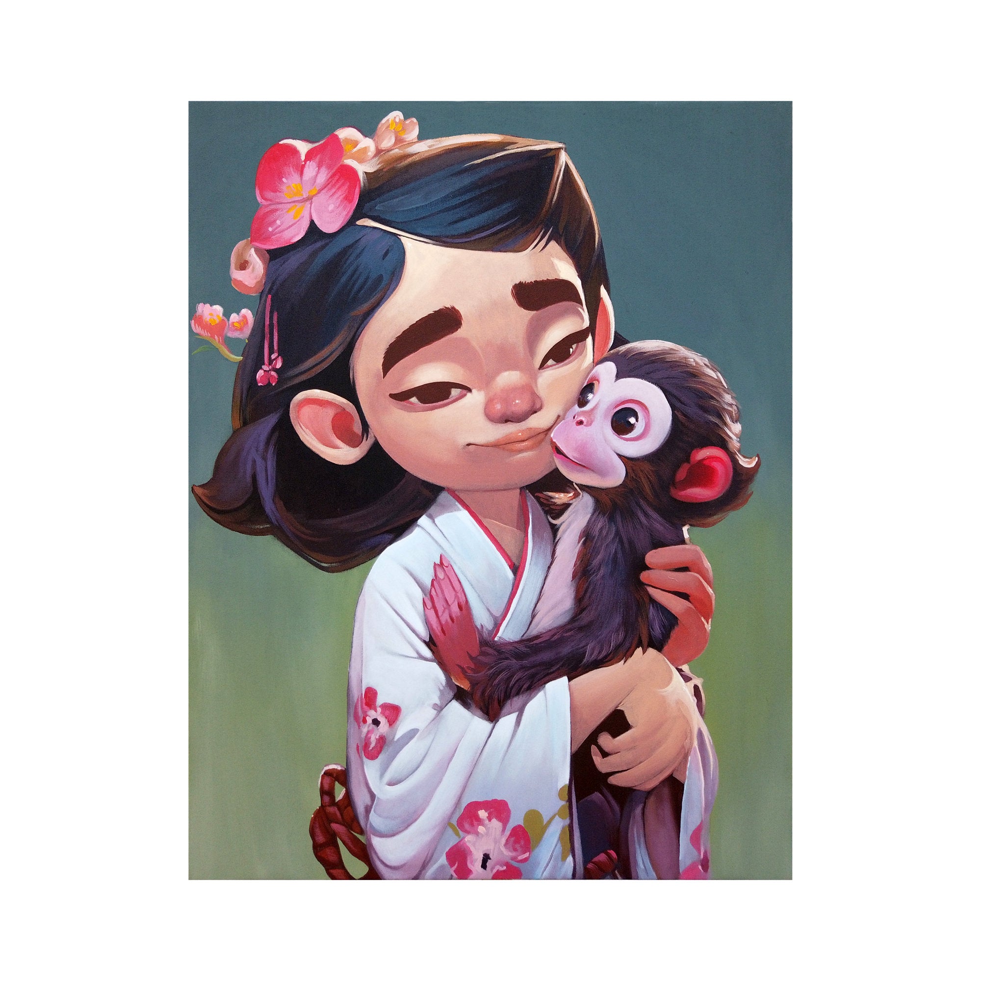The painting titled Competence portrays a young girl in a white floral kimono gently embracing a small monkey with warmth and affection. Both of their expressions convey a sense of trust and joy, reflecting a deep bond. In Chinese culture, the monkey zodiac represents intelligence, agility, and cleverness. People born under this sign are known for their ability to identify the core of a problem and find complex yet effective solutions. The soft colors and oriental atmosphere in this artwork enhance its sense of harmony while subtly highlighting the wit and versatility that define the monkey's character.