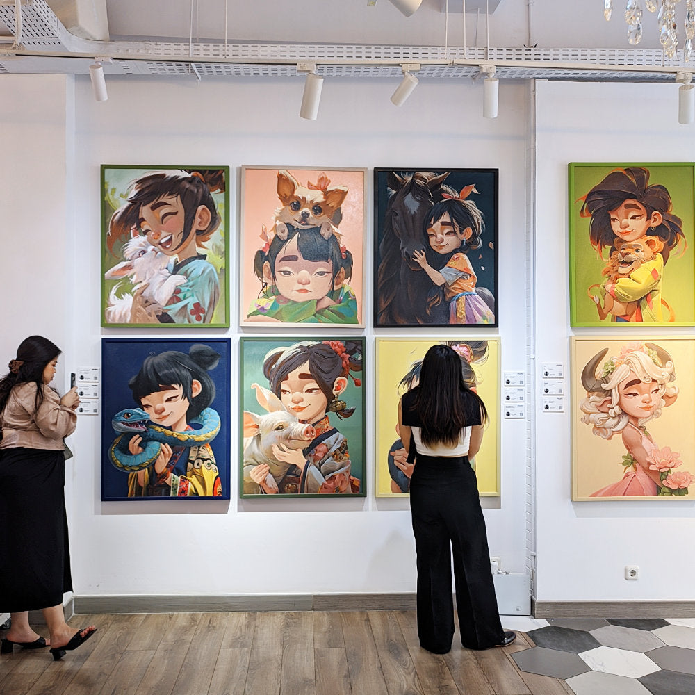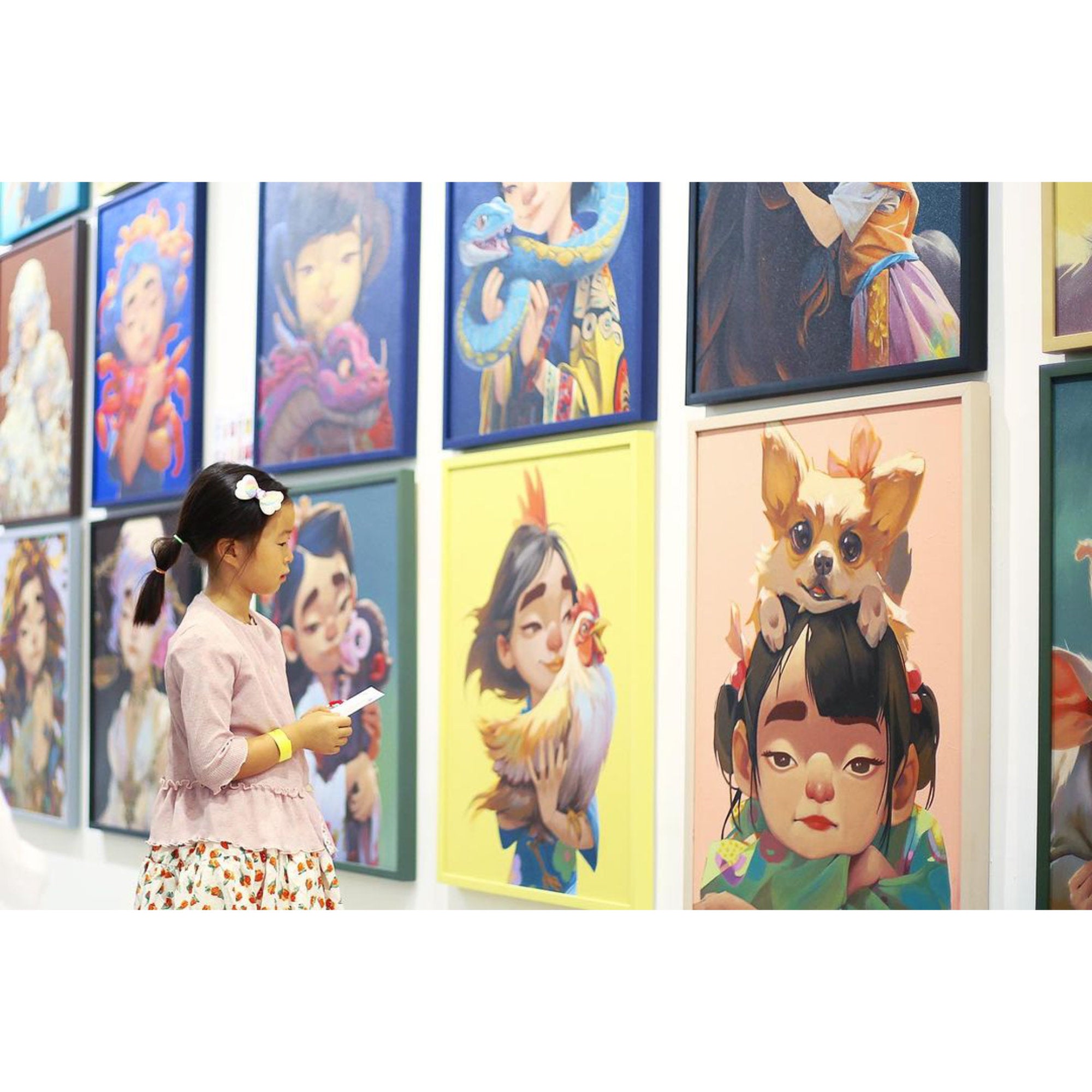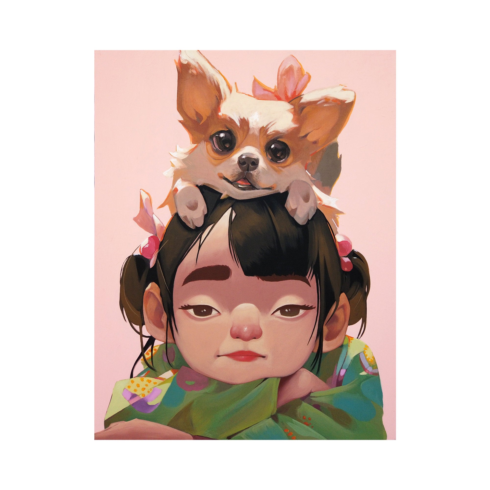 This artwork depicts a young girl with a calm expression wearing colorful clothing, with a small dog resting gently on her head. The two appear perfectly in sync, radiating warmth and genuine companionship. In Chinese culture, the dog zodiac represents honesty, loyalty, and trustworthiness. People born in the year of the dog are known to be kind-hearted, good at keeping secrets, and capable of inspiring trust in others. With its soft and vibrant style, this artwork beautifully captures the essence of these traits while conveying a message of love and trust.
