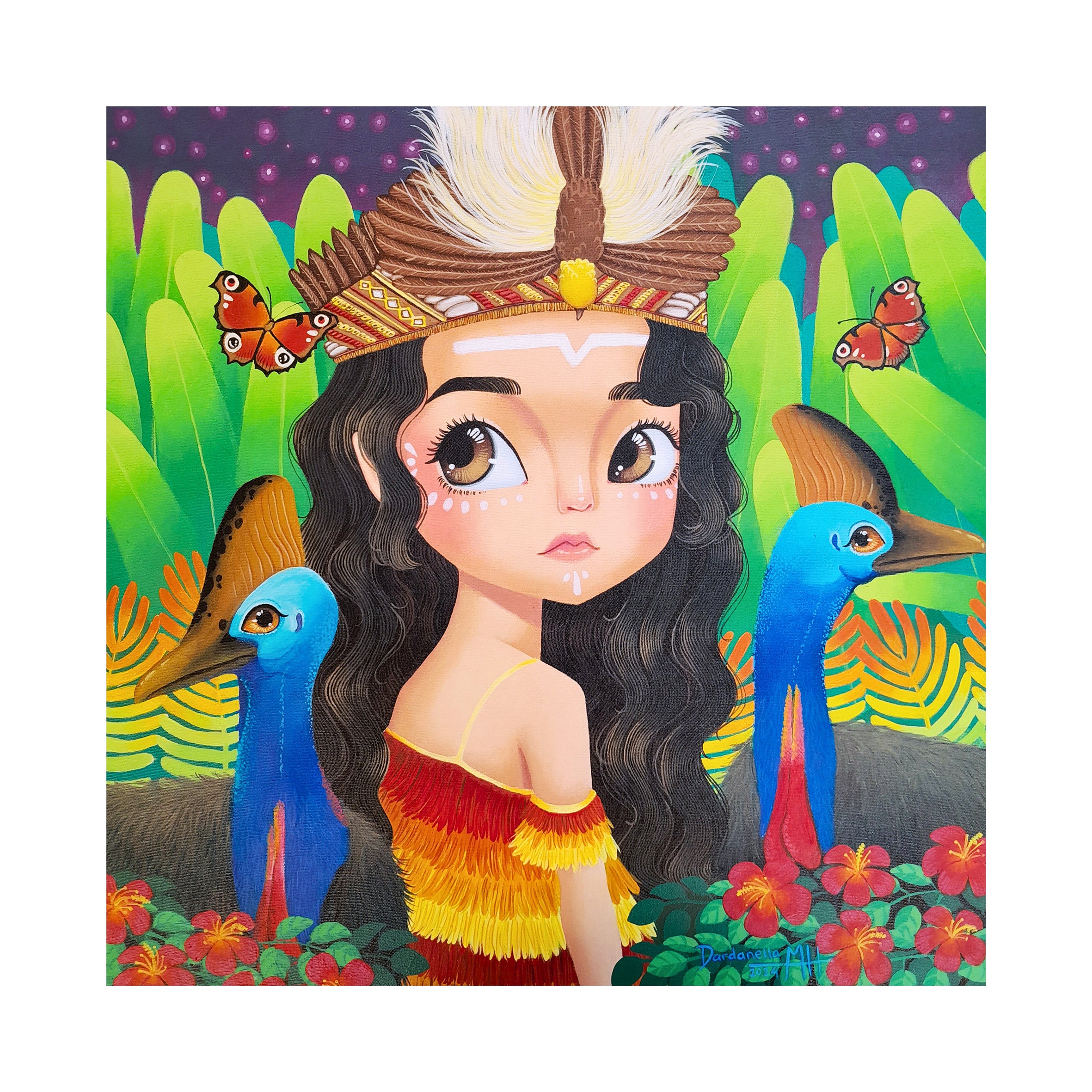 This painting portrays a Papuan woman wearing a Bird of Paradise crown and facial markings. She stands in the midst of a lush tropical forest filled with exotic flowers, accompanied by two cassowaries. In Papuan culture, the Bird of Paradise crown holds deep sacred meaning, symbolizing high social and spiritual status. It is traditionally worn only by an ondoafi (tribal leader) and their descendants, serving as a symbol of honor and respected position.