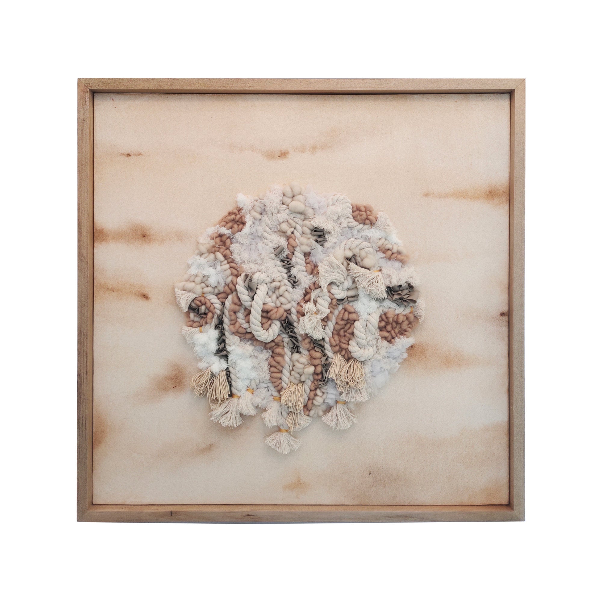 The painting titled Rise at Dawn illustrates an emotional journey of someone rising from adversity. The irregular and layered textile forms reflect the chaos that often surrounds our lives, yet also represent movement and the potential for transformation. The warm-toned background, resembling earth touched by early morning sunlight, evokes a sense of hope and a fresh beginning. This artwork invites us to see that within disorder and spontaneity, there is a natural miracle a process of healing and release that comes from within.