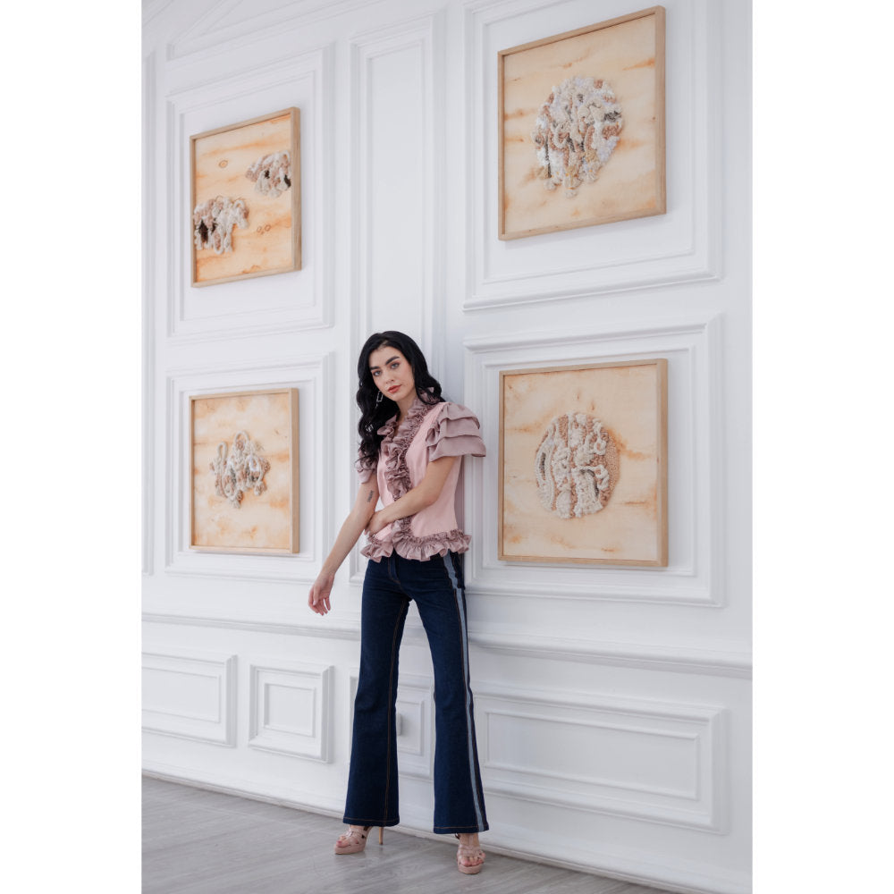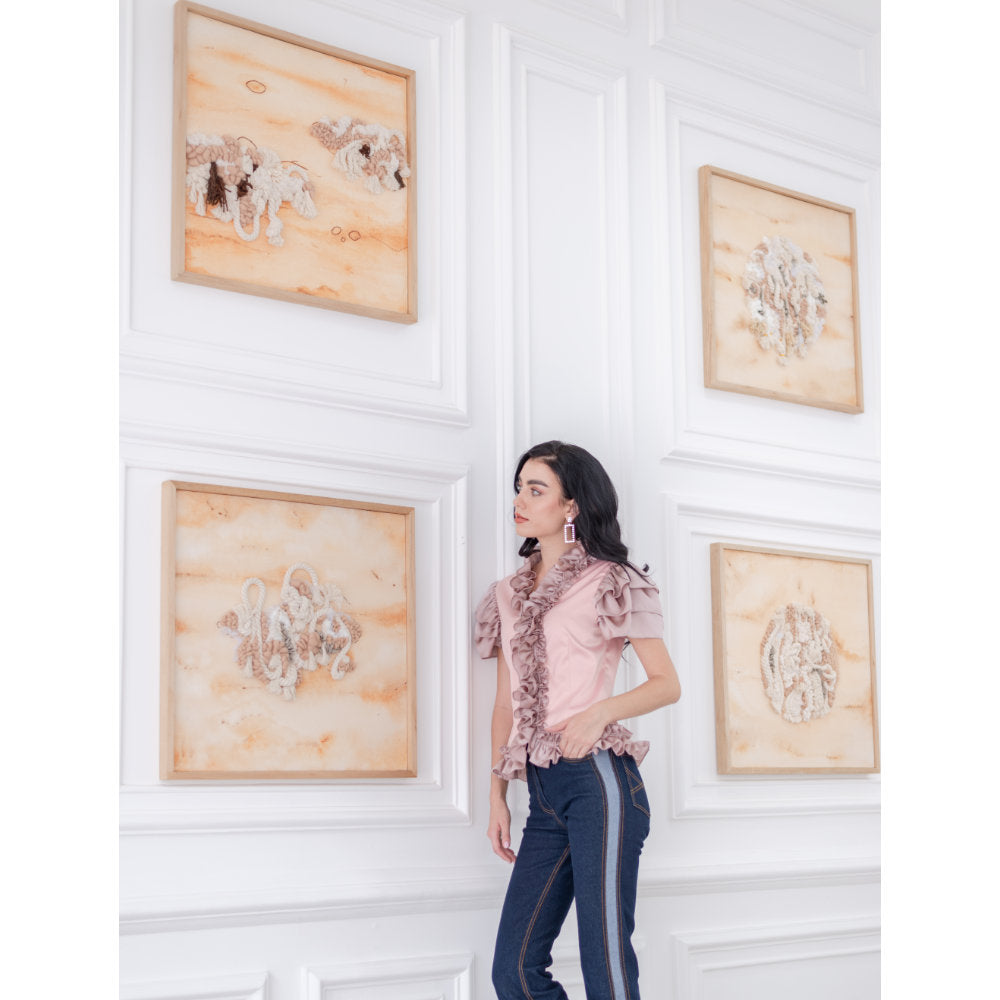 Karya ini menggambarkan perjalanan emosional seseorang dalam proses bangkit dari keterpurukan. Bentuk-bentuk tekstil yang tidak beraturan dan saling bertumpuk mencerminkan ketidakteraturan hidup yang sering kali menyelimuti kita, namun juga menunjukkan dinamika dan potensi untuk berubah. Latar bernuansa hangat seperti permukaan tanah yang terkena sinar mentari dini hari memberikan kesan harapan dan awal yang baru. Karya ini mengajak kita melihat bahwa dalam ketidakteraturan dan spontanitas, ada keajaiban yang muncul secara alami sebuah proses penyembuhan dan pelepasan yang datang dari dalam diri.