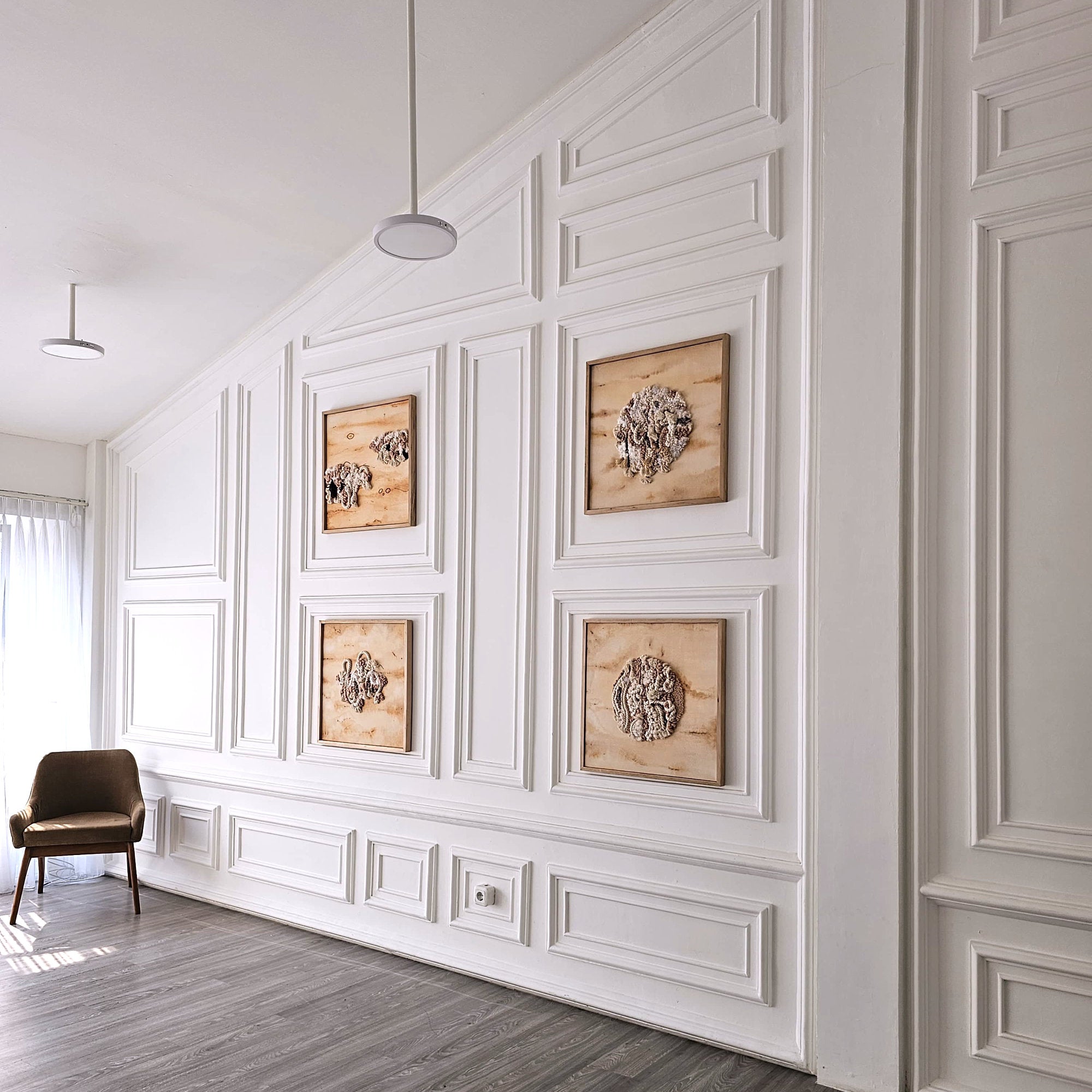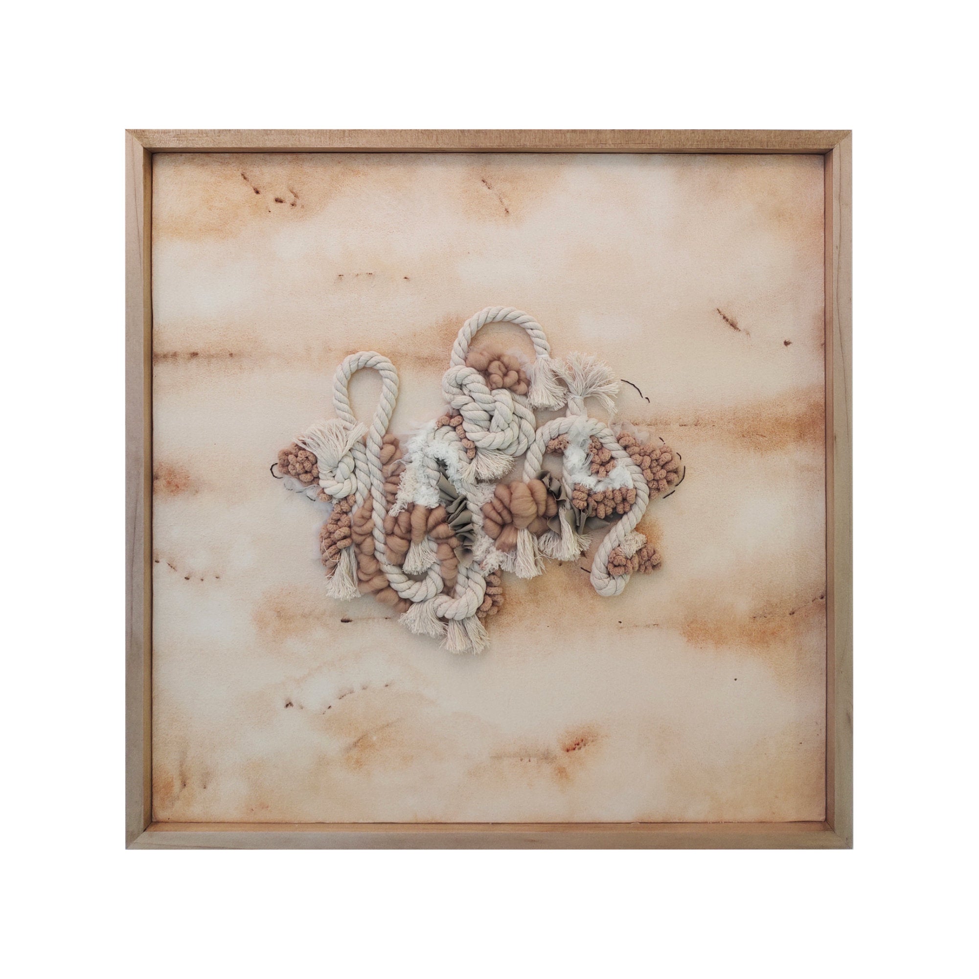 The painting titled Rise at Dawn illustrates an emotional journey of someone rising from adversity. The irregular and layered textile forms reflect the chaos that often surrounds our lives, yet also represent movement and the potential for transformation. The warm-toned background, resembling earth touched by early morning sunlight, evokes a sense of hope and a fresh beginning. This artwork invites us to see that within disorder and spontaneity, there is a natural miracle a process of healing and release that comes from within.
