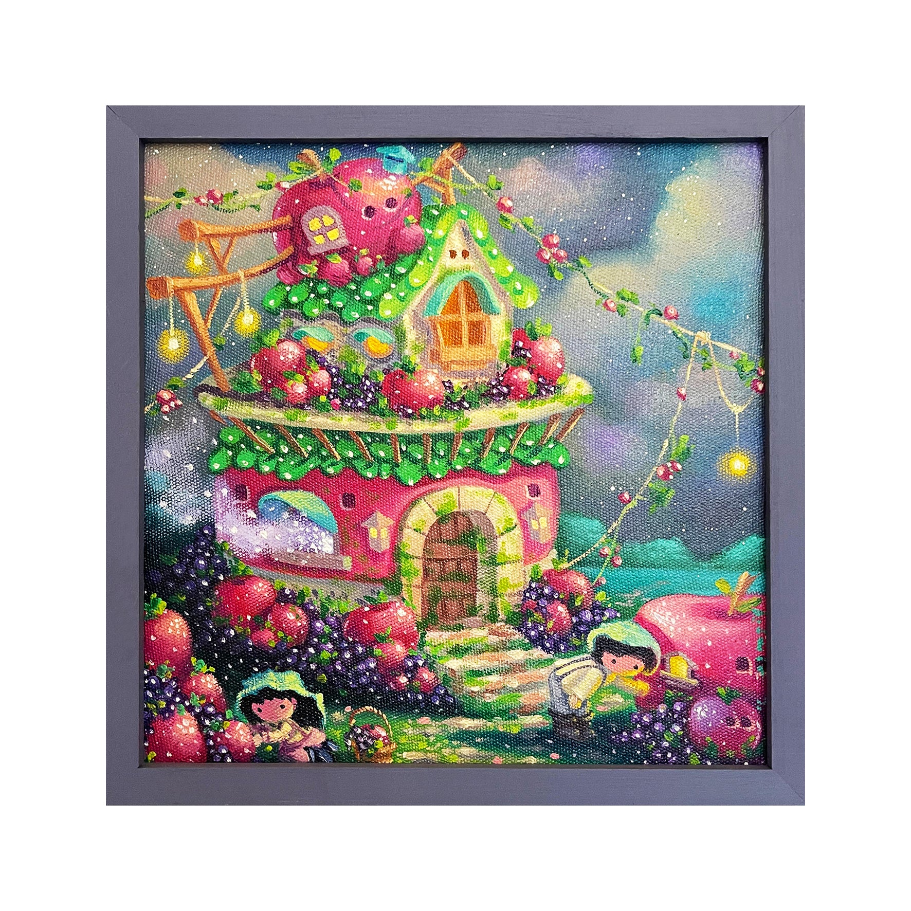 Depicting a home or dwelling that is always blessed with abundant sustenance, good health, and peace for its residents. The visual representation of this piece is shown through oversized apples and strawberries shaped like houses, with the smallest fruits as large as pumpkins. Apples and strawberries are known symbols of prosperity, wealth, health, peace, and good fortune. This painting represents an ideal place to live, where the inhabitants can experience a peaceful, calm, and joyful atmosphere, along with a deep sense of gratitude.