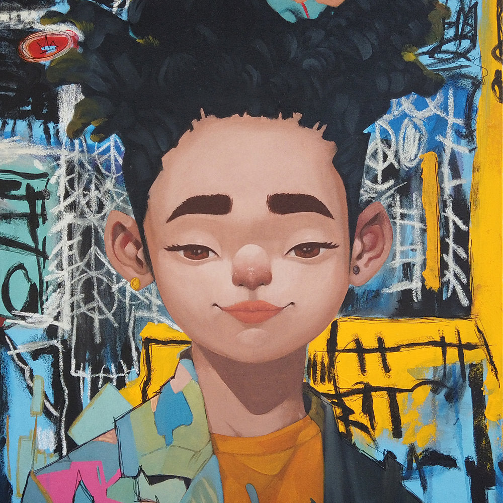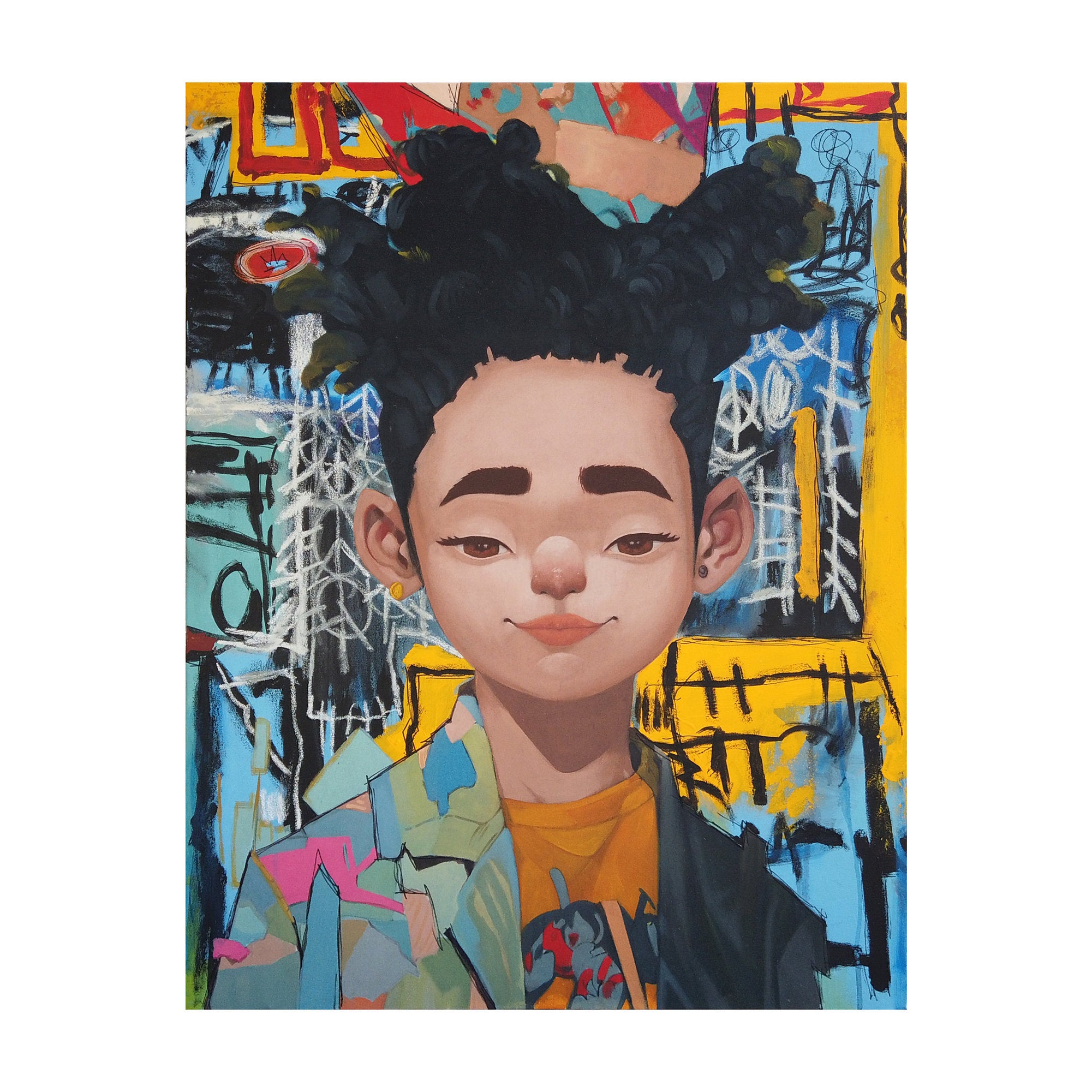 This painting portrays a young person with a calm and confident expression, surrounded by a colorful, graffiti-like background that feels chaotic yet full of energy. Set against the backdrop of what has been called the “new abnormal” a time marked by wildfires, global warming, and a pandemic the artwork reflects the resilience of the younger generation in facing modern challenges. The figure's bold and individual style suggests that even in a world filled with threats and uncertainty, there remains space for hope, self-expression, and the courage to stay true to oneself.