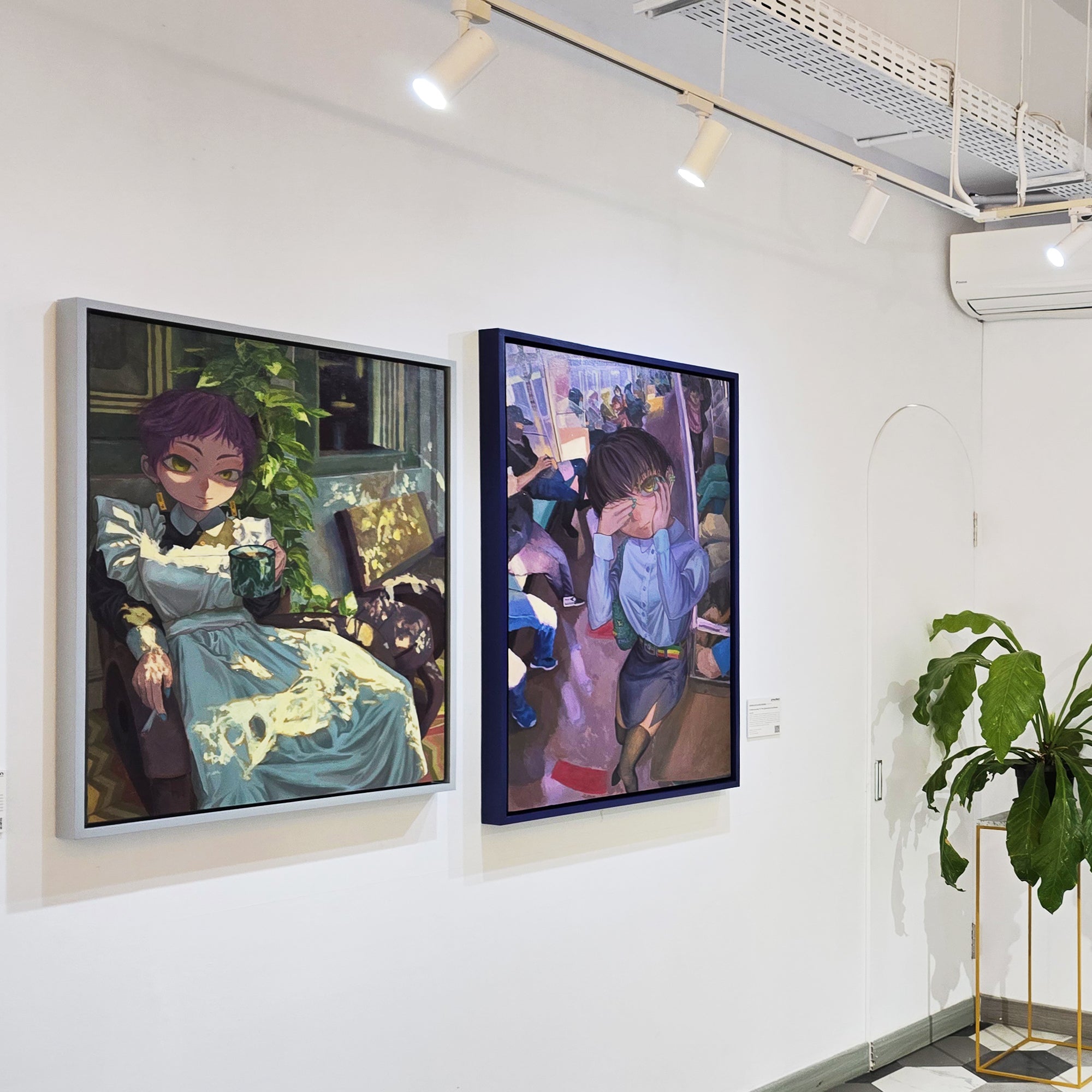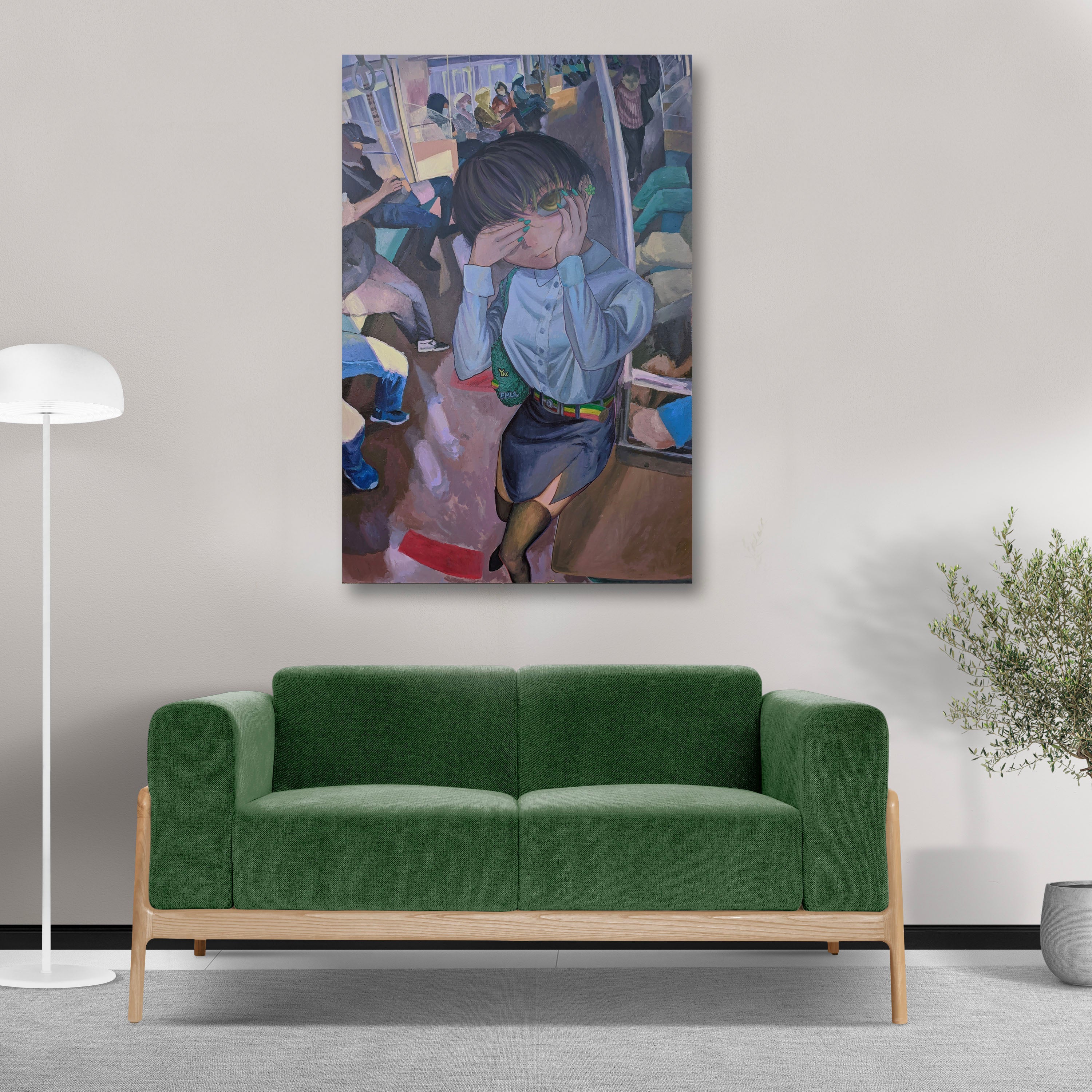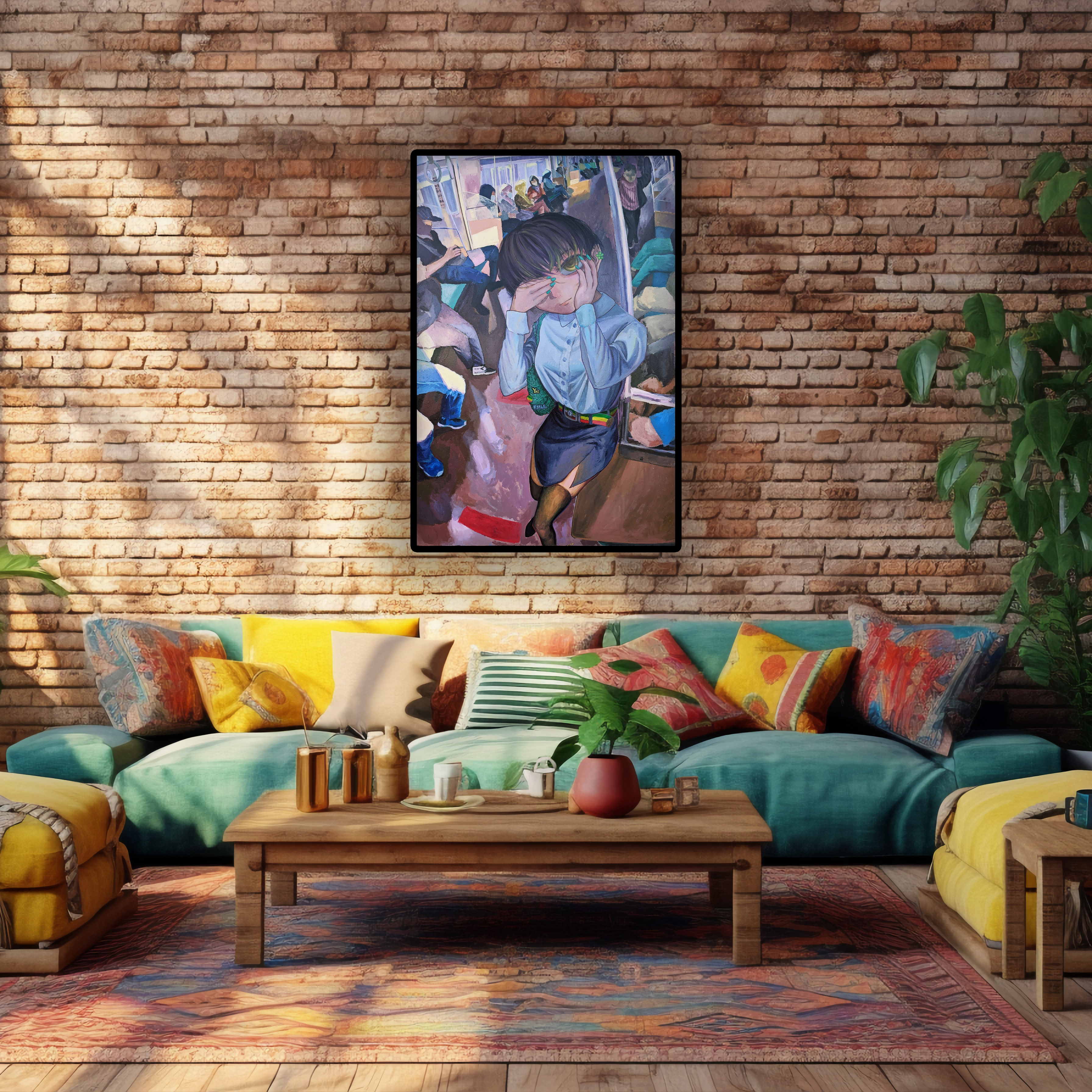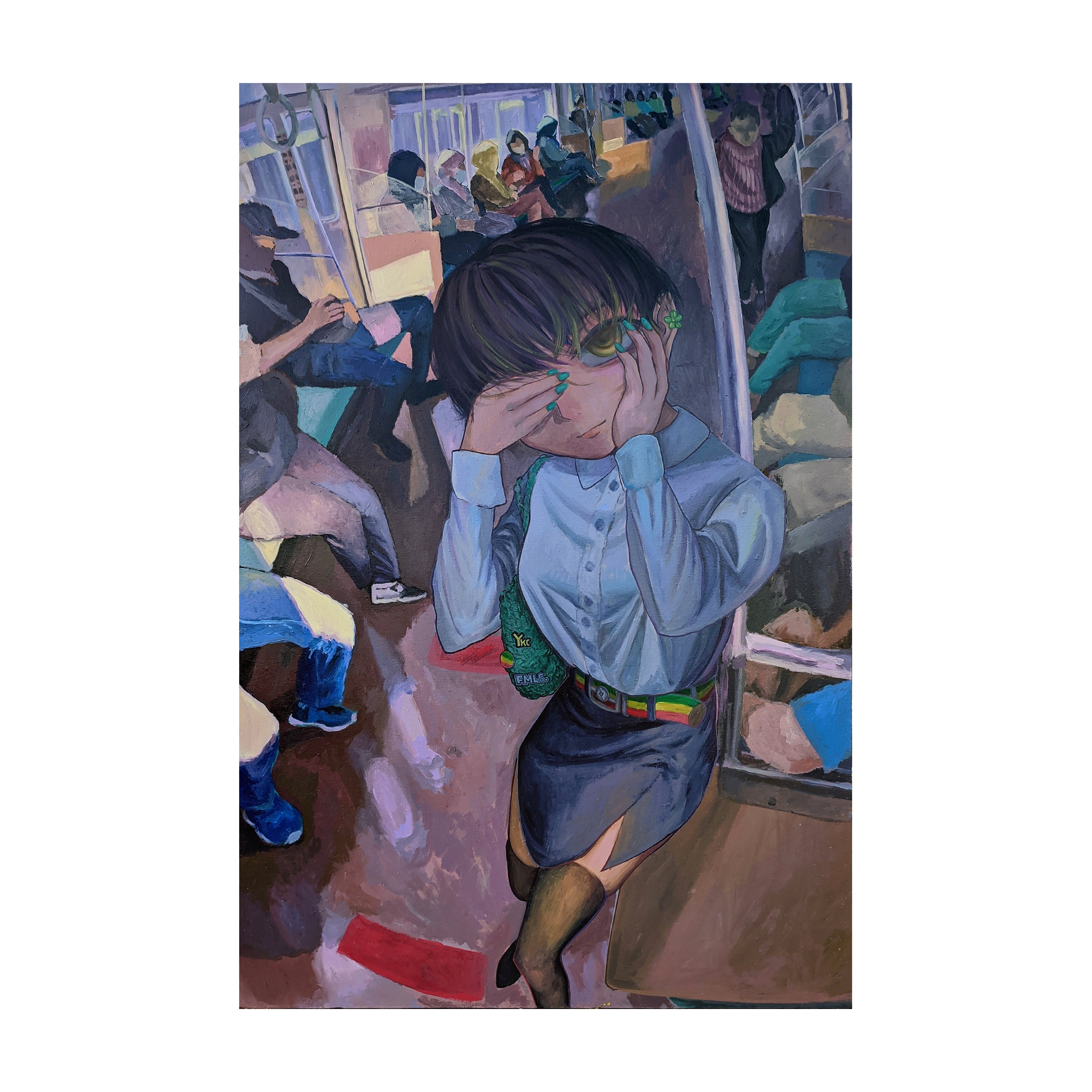 This artwork is inspired by the song Menunggu Berakhir Luka by NDX AKA, with a personal interpretation using personification as a visual element. The long KRL train carriage without partitions, crowded with people yet feeling empty, reflects the feelings of a man whose love has been rejected. Although the woman is in his "carriage," he feels hollow because she chooses another man, leaving him only as a spectator to her happiness with someone else.