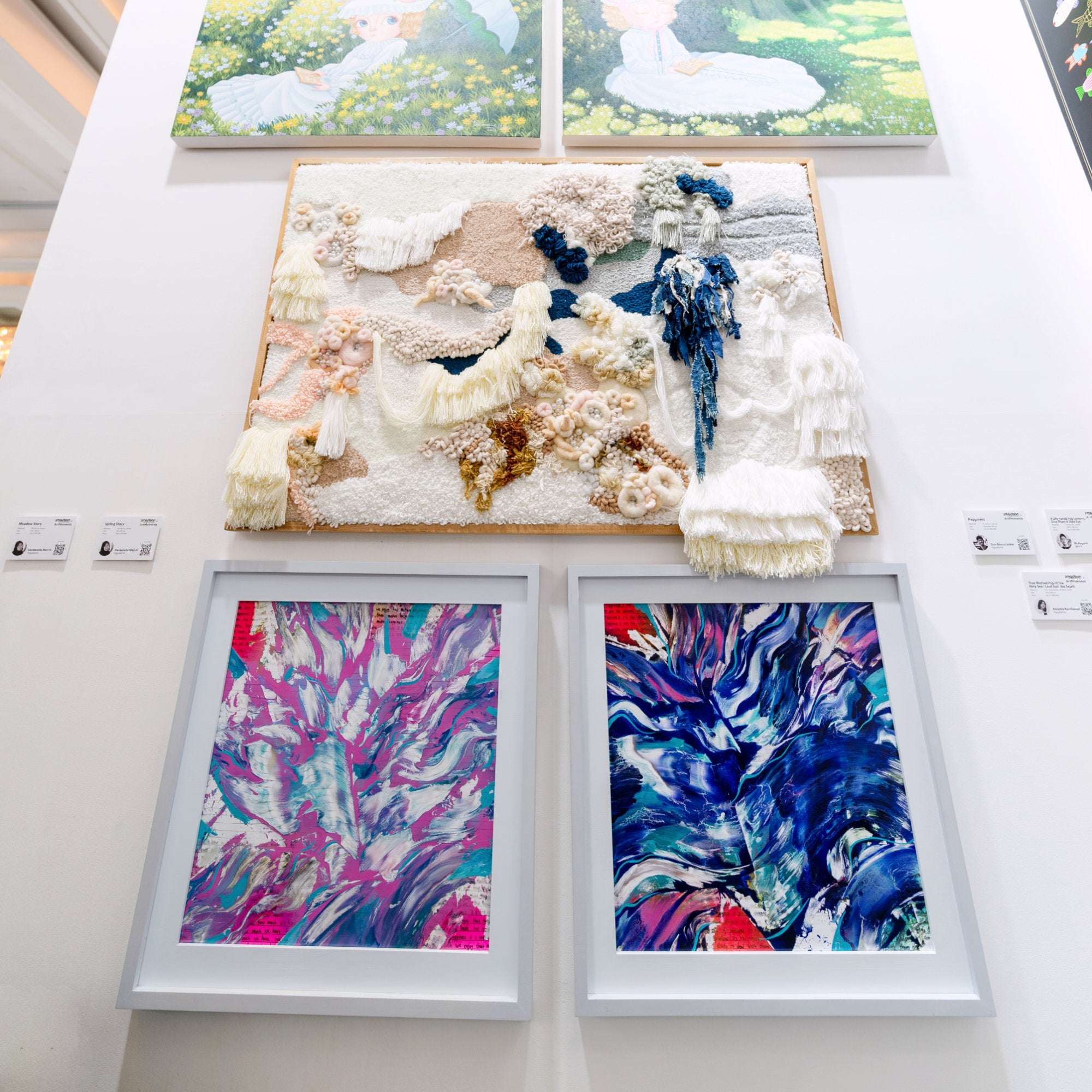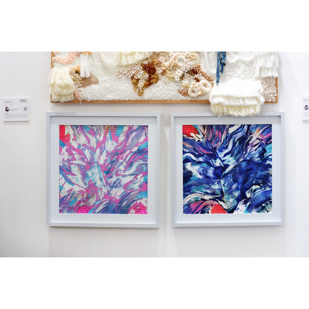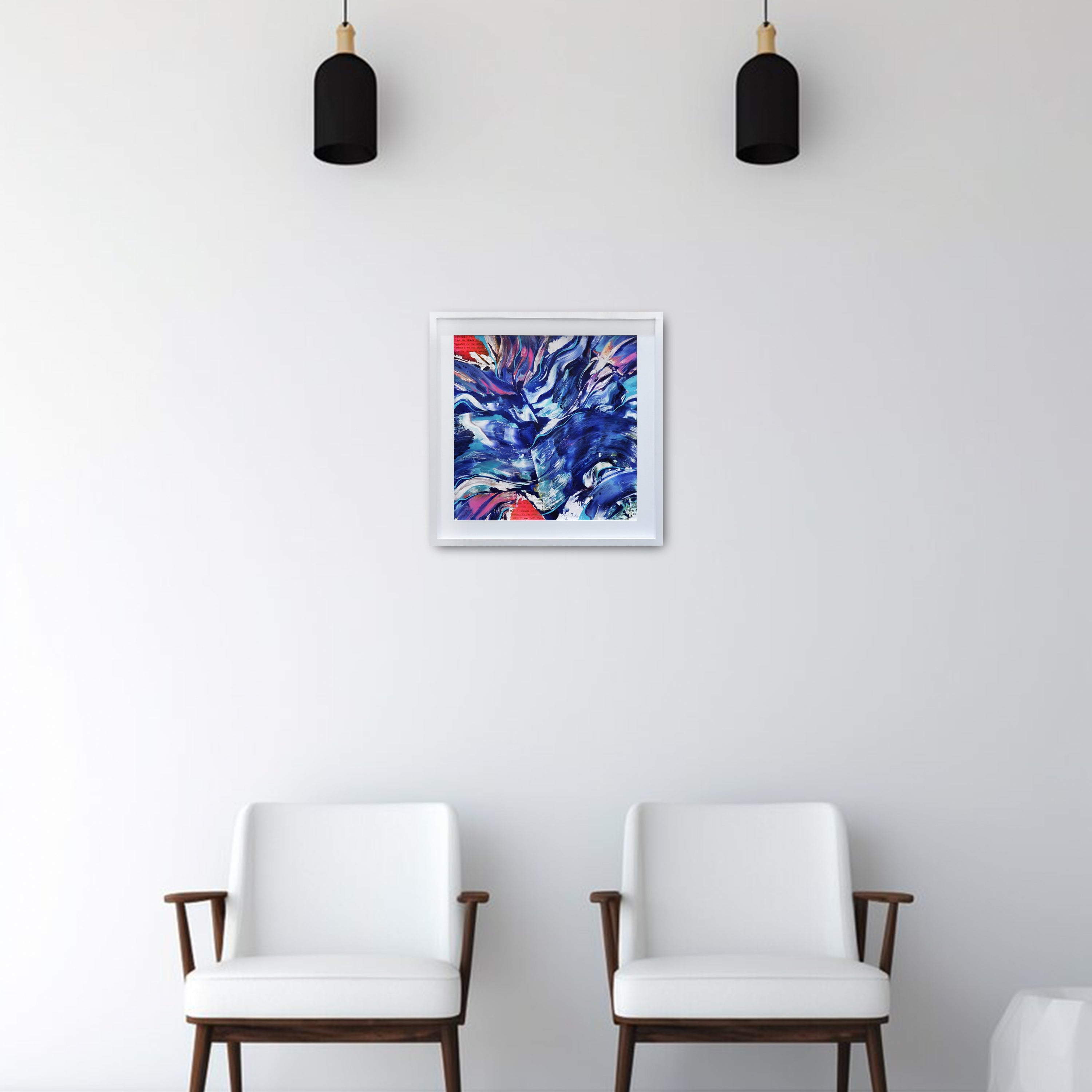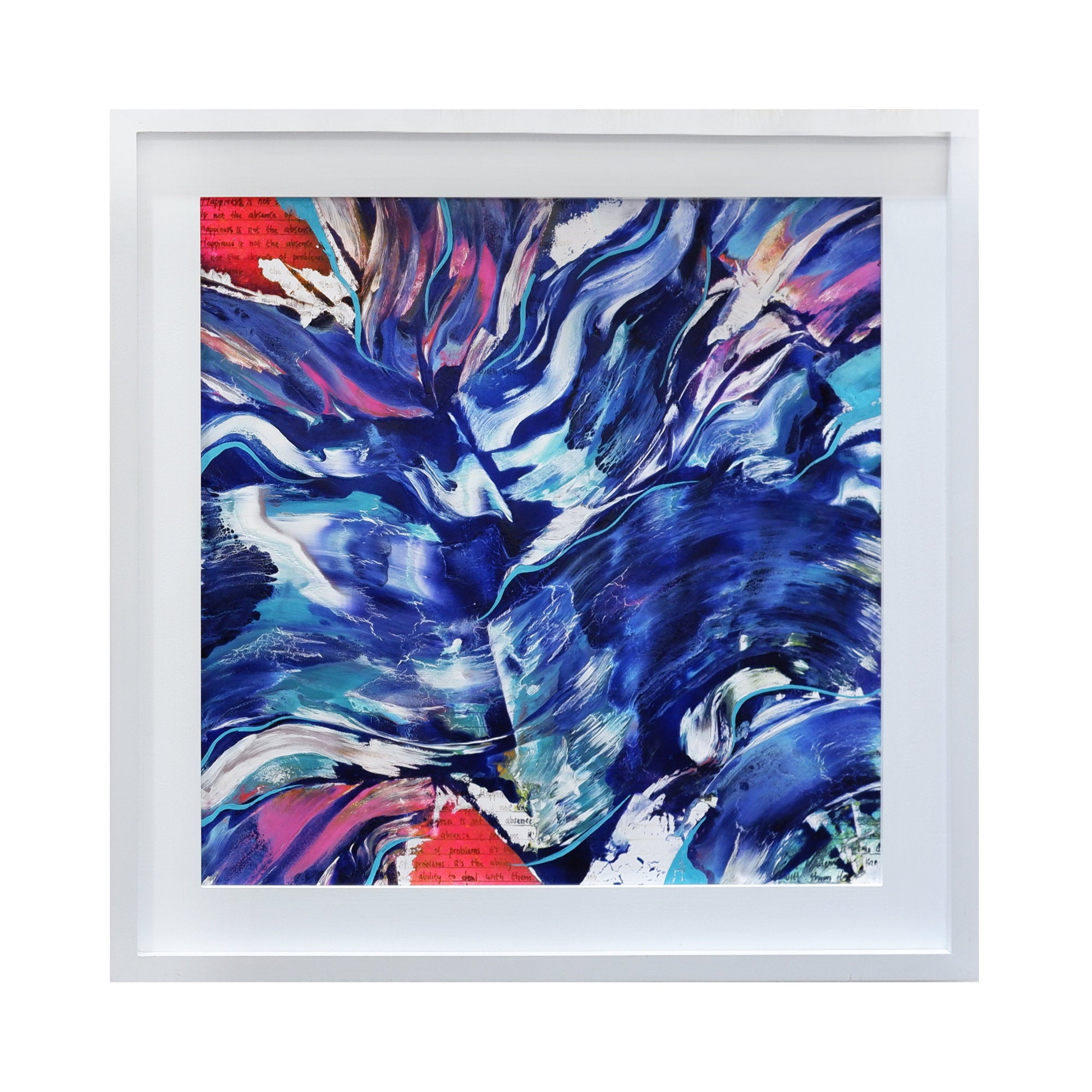 This artwork conveys an important message about the need for self-introspection reflecting on how far we’ve come in appreciating, valuing, and bringing joy to ourselves. In this piece, faint positive texts appear as symbols of how we speak, behave, and think positively about happiness, regardless of the challenges we’ve faced. The use of blue and pink enhances the visual expression of how we experience and respond to happiness in life.