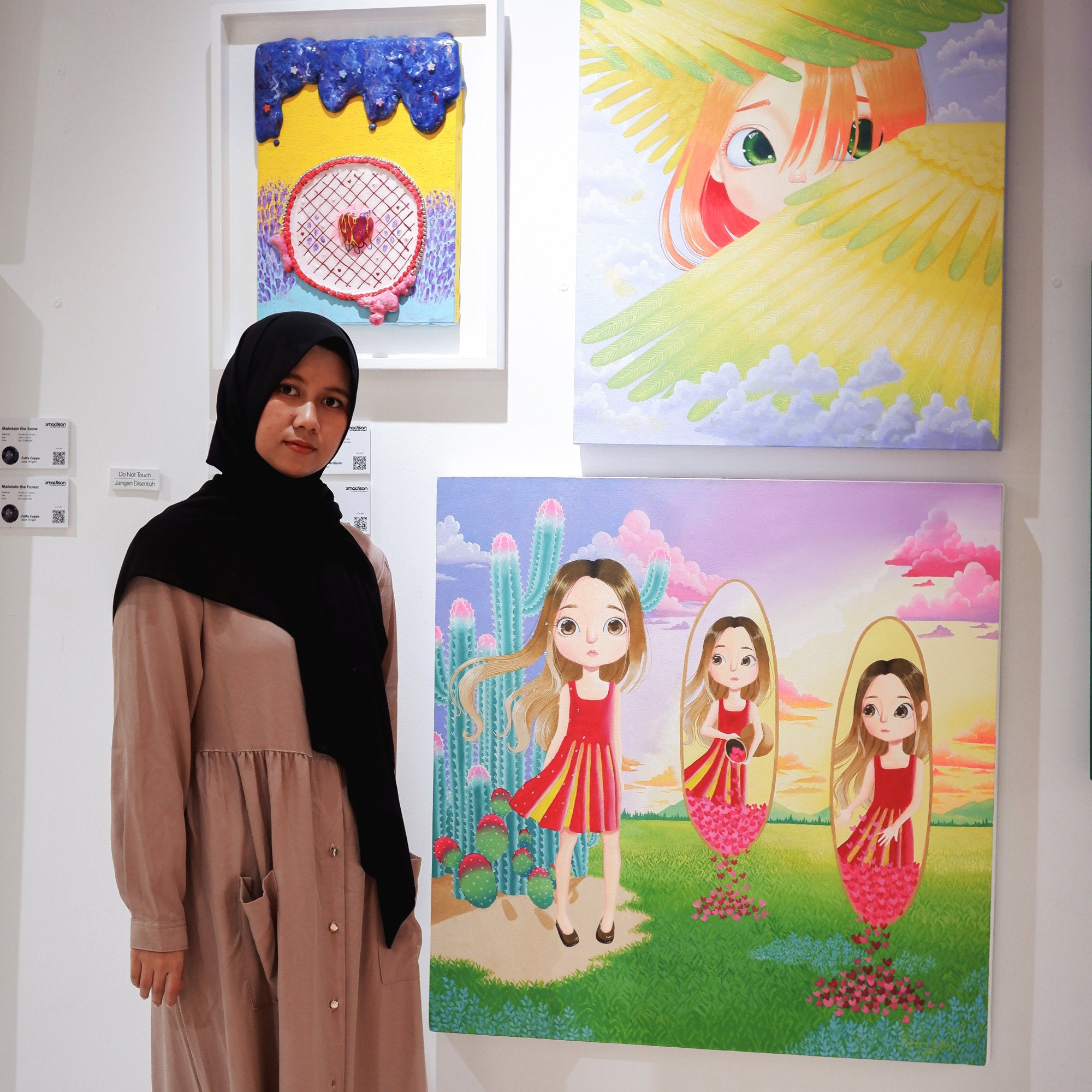 Sang seniman menggambarkan sosok gadis bermata hijau besar yang tampak bersembunyi di balik lapisan bulu-bulu kuning kehijauan, seperti sayap-sayap perlindungan di antara awan. Ekspresinya yang waspada namun lembut merefleksikan jiwa introvert yang lebih nyaman berdiam di balik pelindung dunia dalamnya sendiri. Warna-warna cerah dan lembut menciptakan paradoks emosional: seolah ada keindahan dalam bersembunyi, dan kedamaian dalam ketidakterlibatan. Lukisan ini menjadi cerminan keinginan untuk hadir, namun tak ingin benar-benar terlihat.