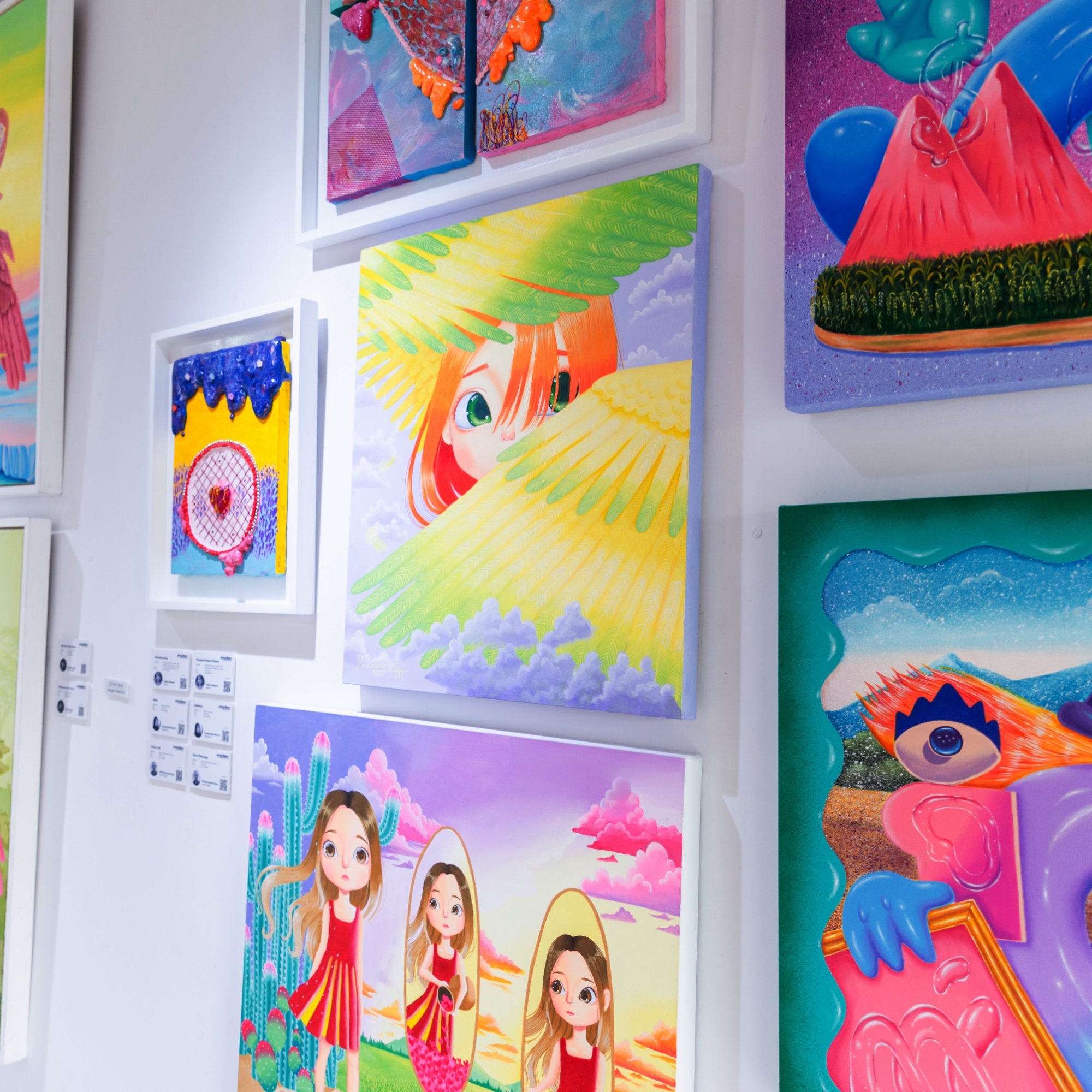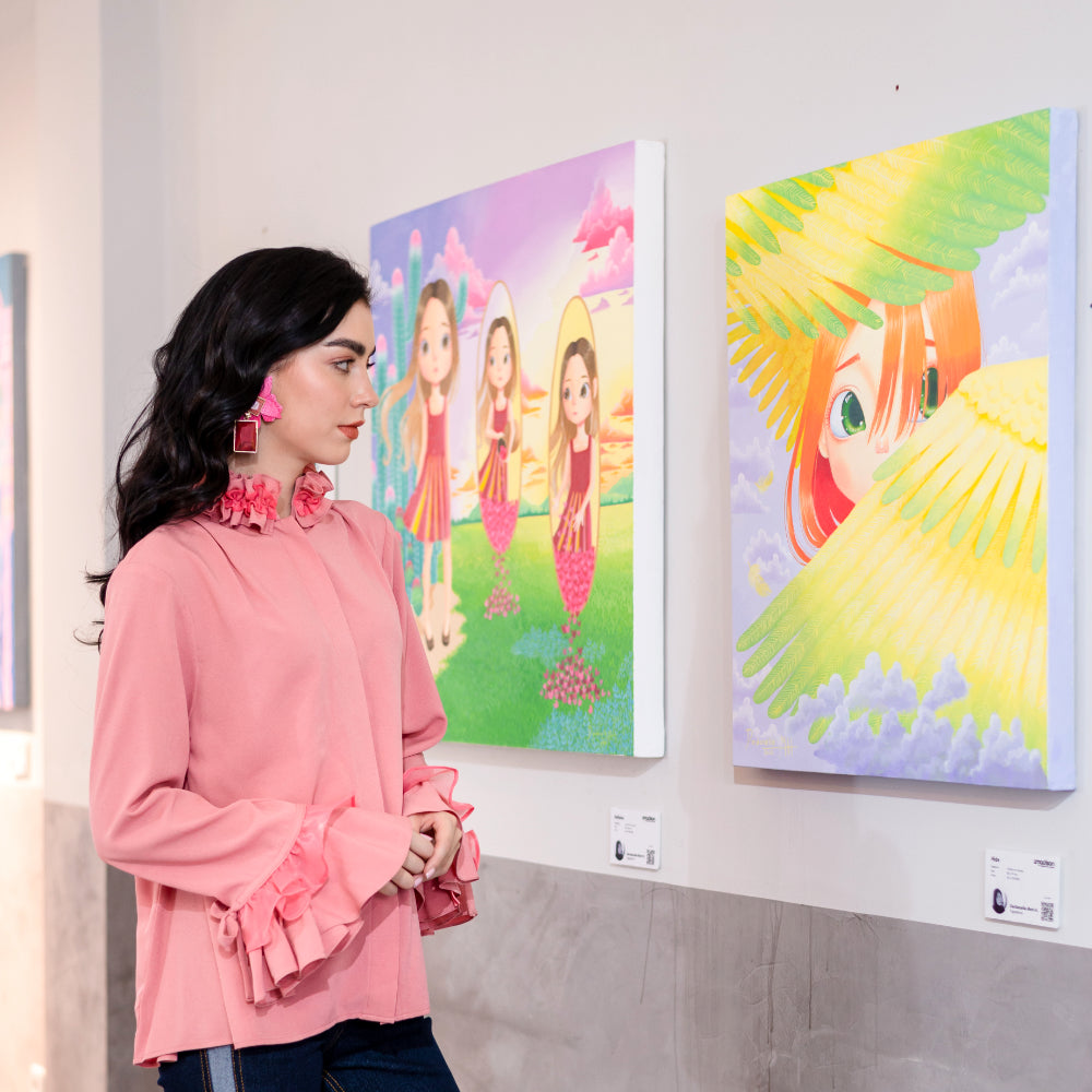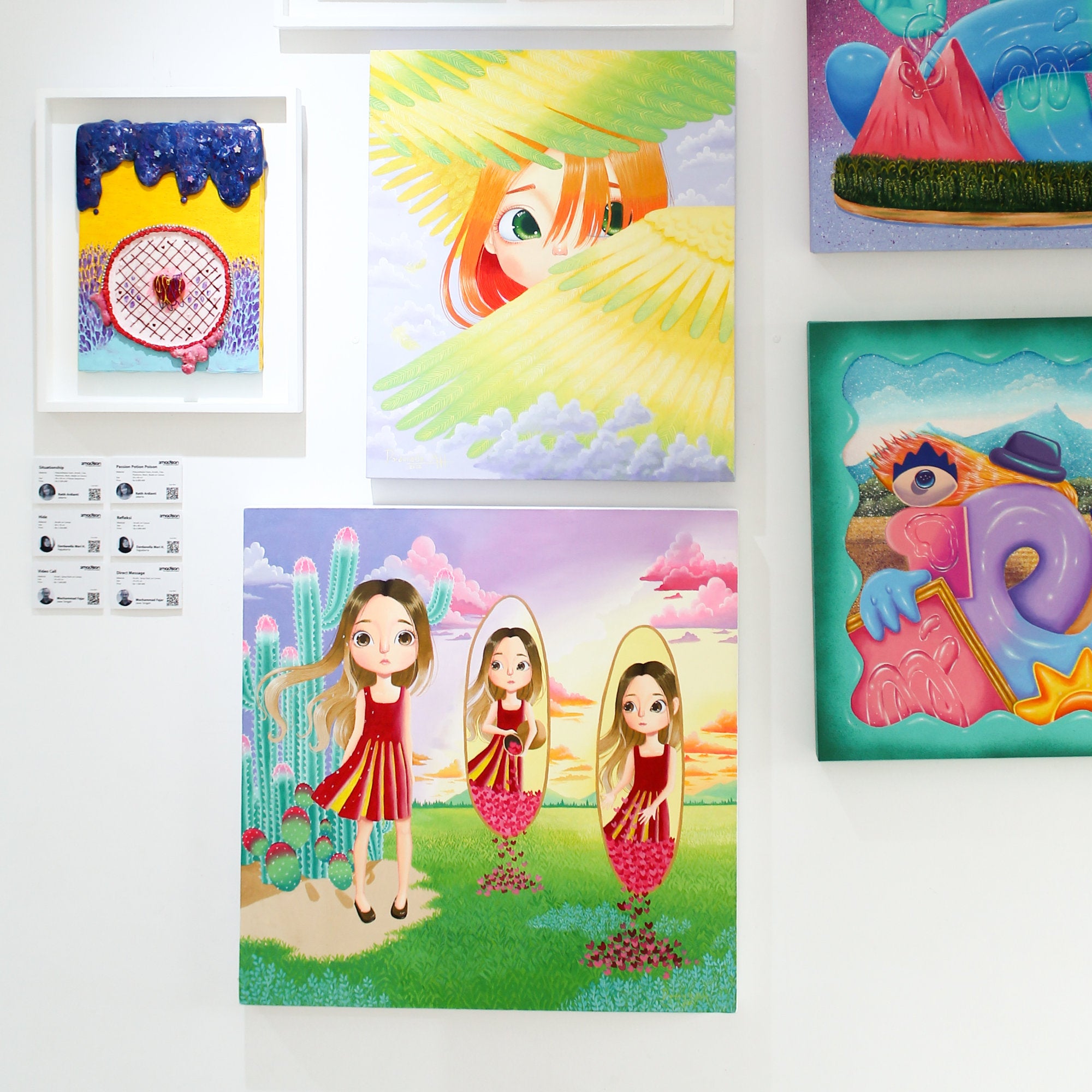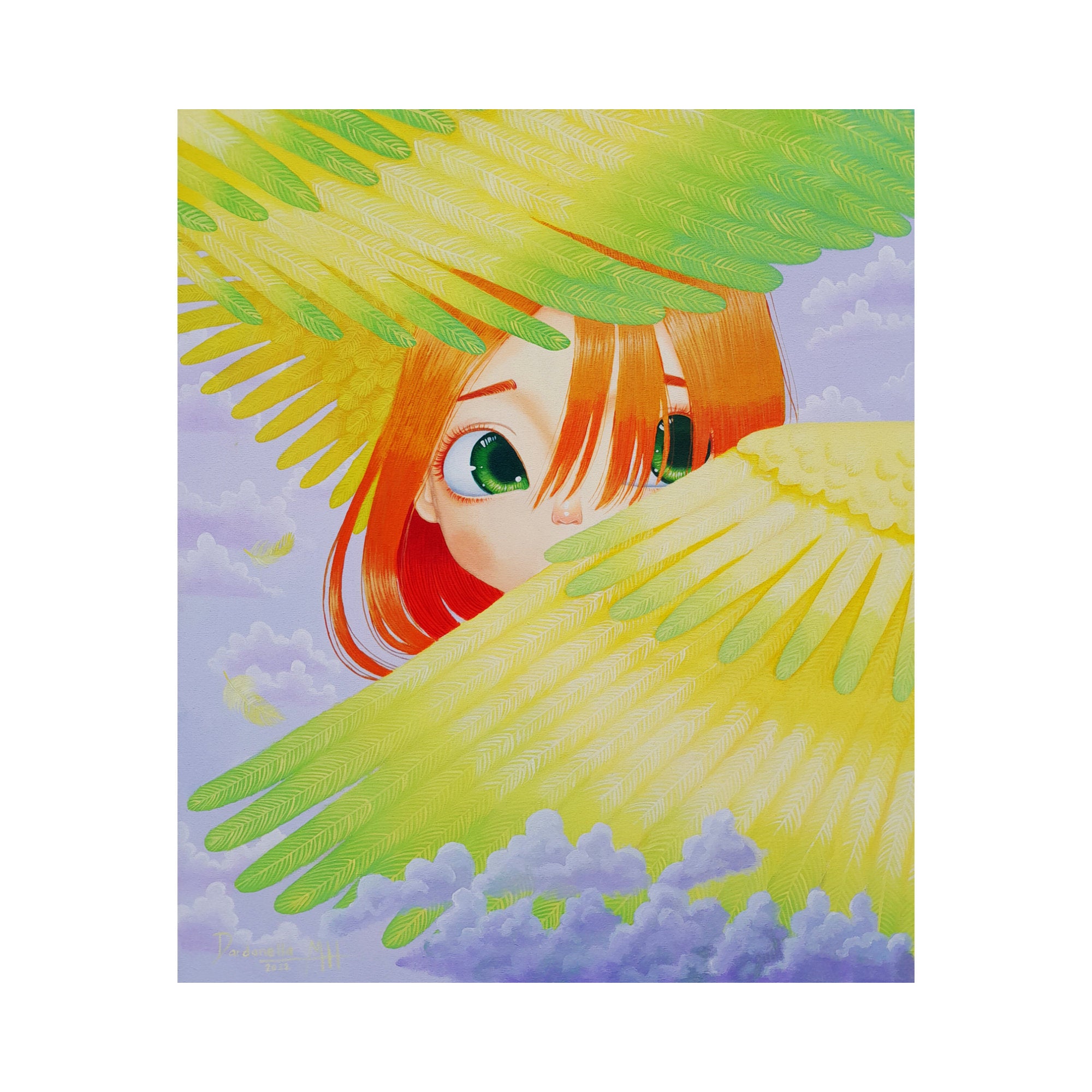 The artist portrays a girl with large green eyes, seemingly hiding behind layers of yellowish-green feathers like protective wings nestled among the clouds. Her expression, alert yet gentle, reflects the soul of an introvert who feels more at ease behind the shield of her own inner world. The soft, bright colors create an emotional paradox: as if there is beauty in hiding, and peace in disengagement. This painting becomes a reflection of the desire to be present, yet not truly seen.