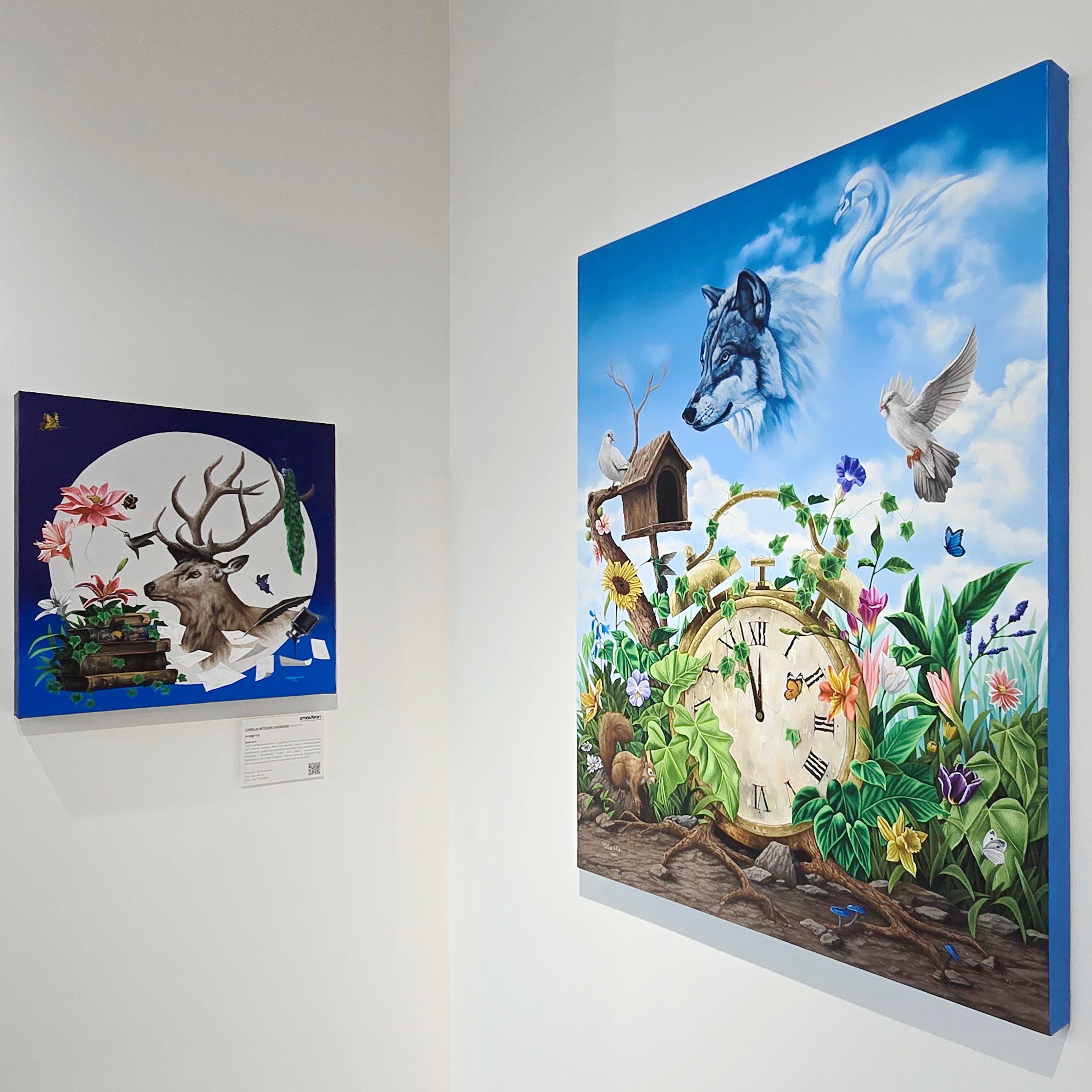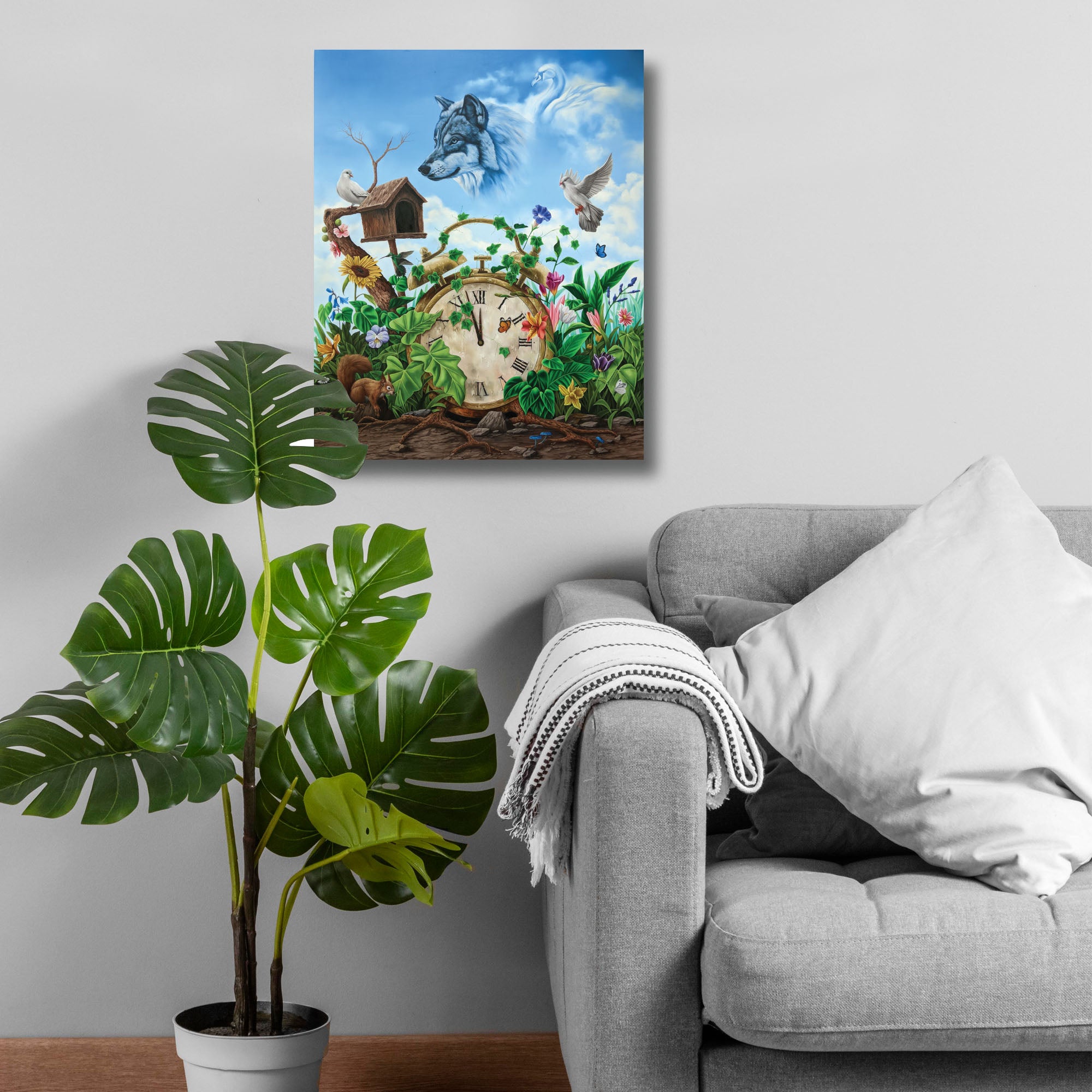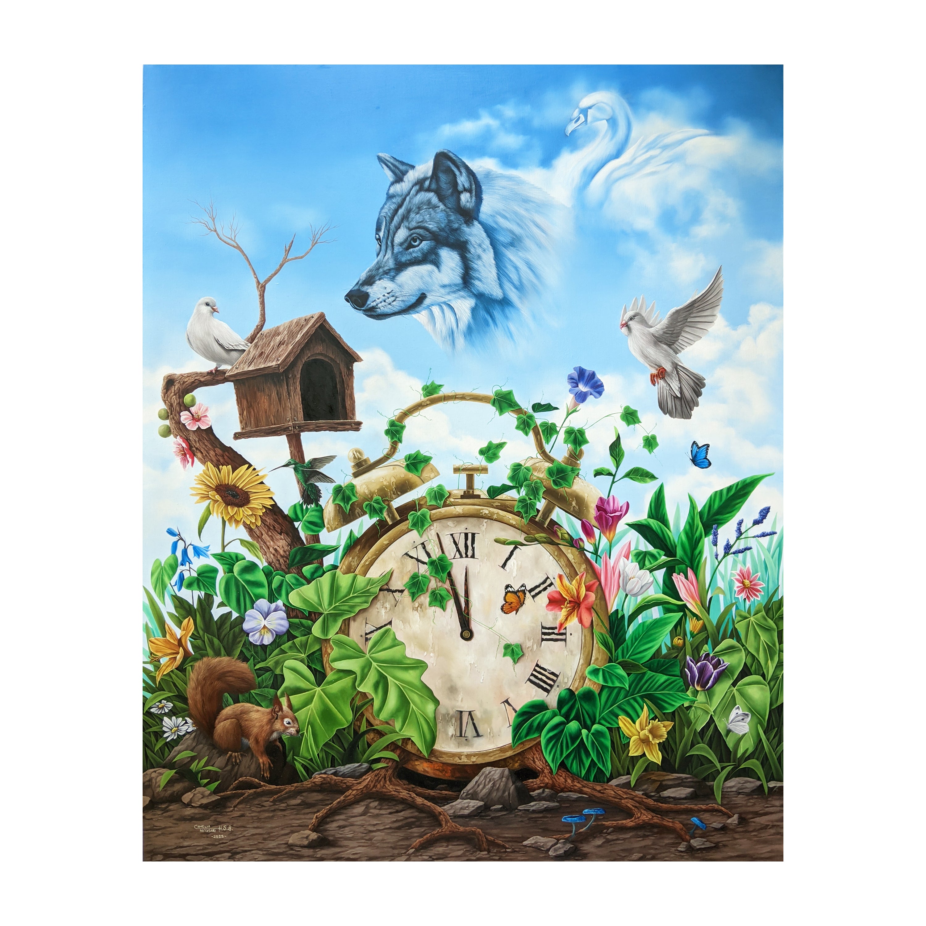 Nature not only gives life but also guidance to humans. In this work, the wolf symbolizes loyalty, the dove represents steadfastness, and the squirrel stands for trust. The clock represents time as a test of loyalty, while the tulip and the sun reflect resilience. The bright blue sky ties all these elements together, symbolizing boundless loyalty.