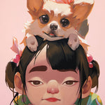 This artwork depicts a young girl with a calm expression wearing colorful clothing, with a small dog resting gently on her head. The two appear perfectly in sync, radiating warmth and genuine companionship. In Chinese culture, the dog zodiac represents honesty, loyalty, and trustworthiness. People born in the year of the dog are known to be kind-hearted, good at keeping secrets, and capable of inspiring trust in others. With its soft and vibrant style, this artwork beautifully captures the essence of these traits while conveying a message of love and trust.