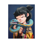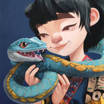 This painting depicts a young girl gently holding a blue snake with a calm and affectionate expression, creating a harmonious atmosphere between human and the symbol of wisdom. In Chinese culture, particularly in the zodiac, the snake represents intuition, intelligence, and deep thinking. The girl's soft face and closed eyes reflect trust and inner connection, suggesting that true wisdom comes from a peaceful balance between heart and mind. The bright colors and detailed oriental-style clothing further enhance the cultural nuance and symbolic meaning of this artwork.