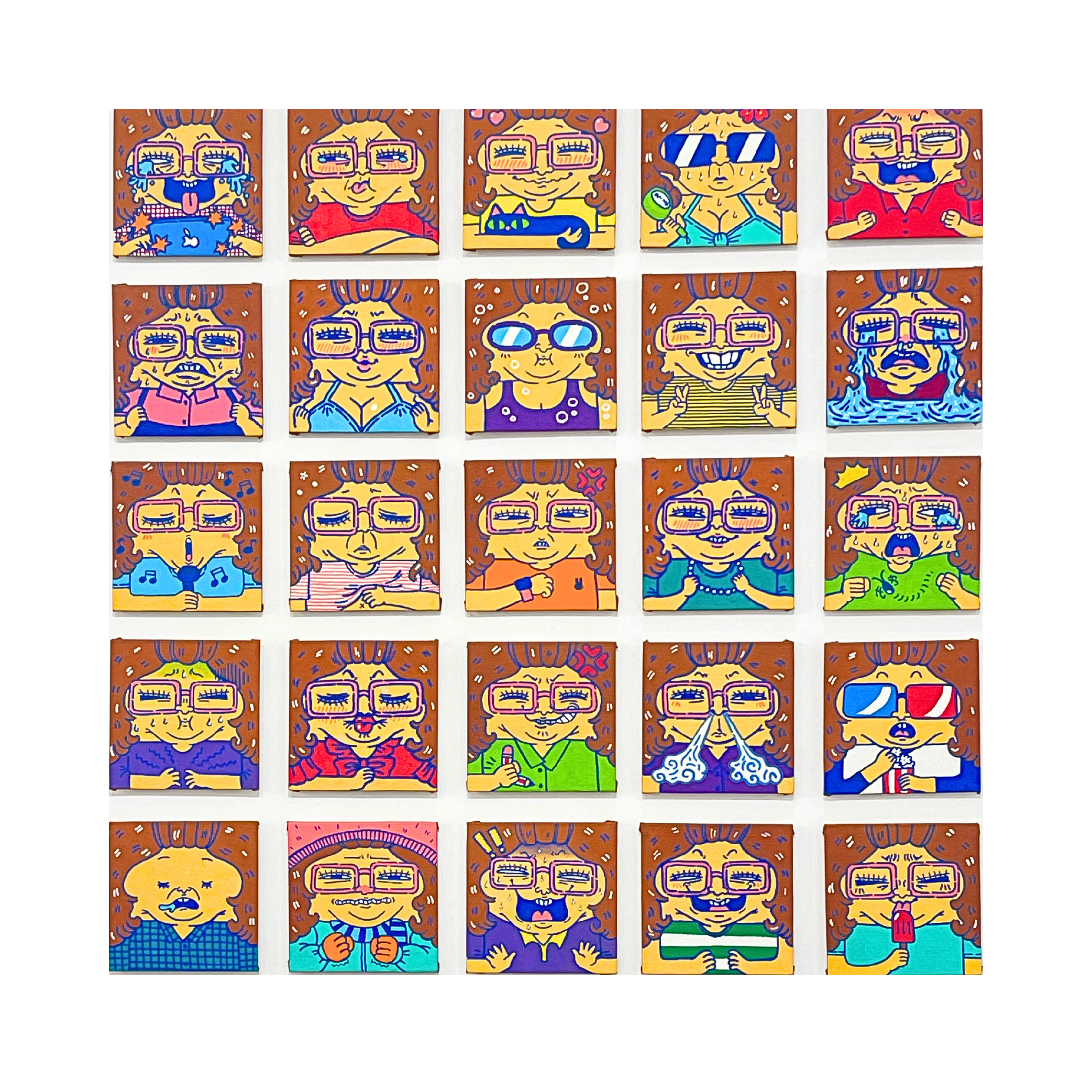 Seri karya ini menggambarkan kehidupan sebagai rangkaian momen yang terkotak-kotak, bingkai-bingkai kecil yang berulang dan mencerminkan rutinitas harian seniman. Setiap panel menampilkan variasi dari sosok yang sama, digambarkan melalui perubahan ekspresi, warna, dan gestur. Meski tampilannya terasa ceria dan penuh warna, strukturnya tetap kaku: setiap momen terkurung dalam batas persegi yang sama.
