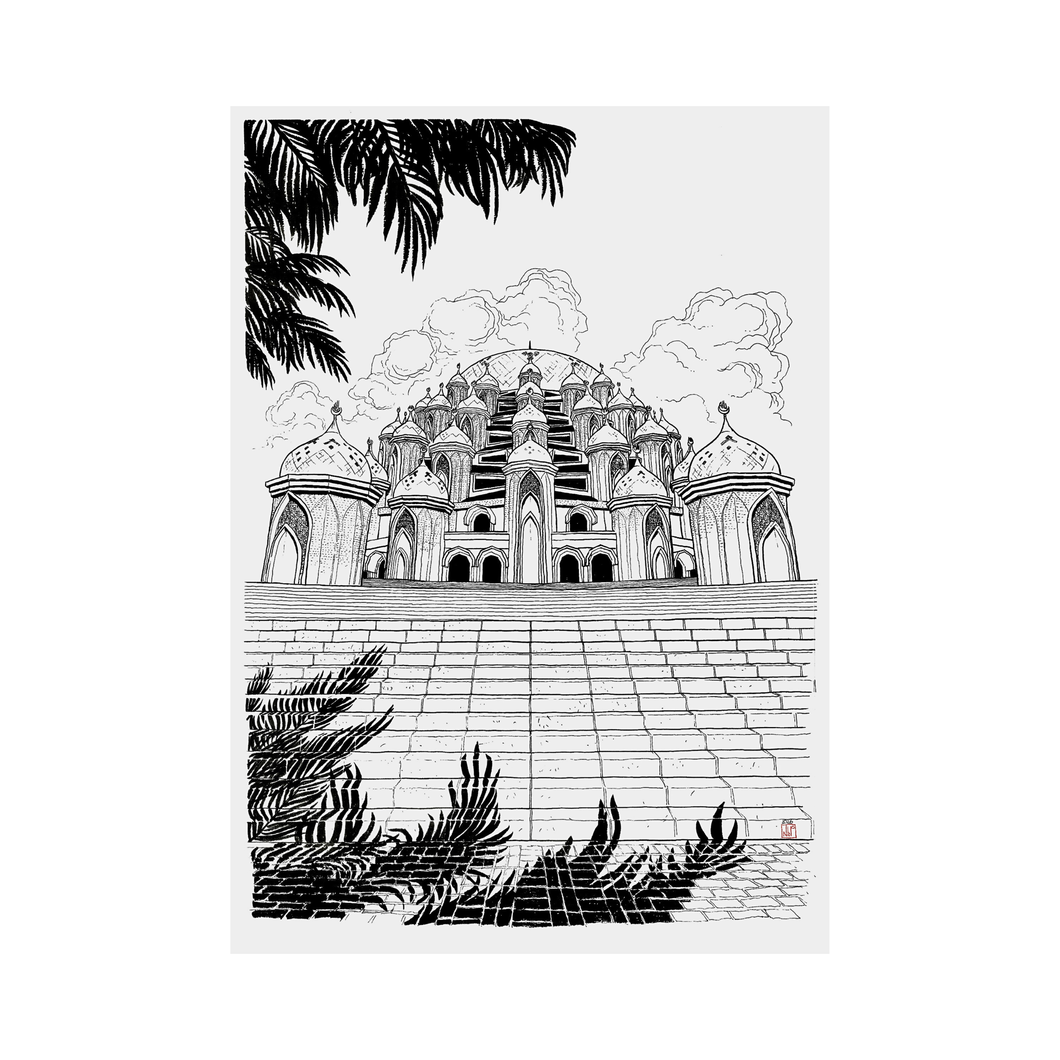 Karya-karya ini merupakan fragmen visual yang merekam pengalaman perjalanan dan ingatan akan kota. Melalui praktik travel sketching, Sang seniman menghadirkan sketsa hitam-putih bergaya noir, menempatkan masjid sebagai fokus, sebagai penanda ruang spiritual sekaligus simpul memori dalam lanskap urban.