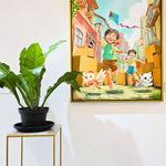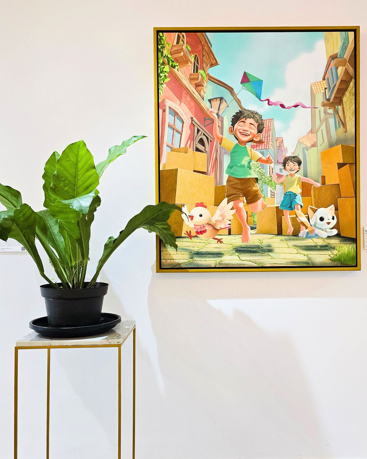 This artwork captures the simple yet meaningful joy of childhood, showing two children running happily down a narrow, light-filled street, accompanied by colorful kites dancing in the blue sky. Behind this happiness lies a philosophy about kites: although they fly high, they are never proud because they are always held by strings that keep them balanced and guided. Like kites, human happiness and achievements are always connected to love, support, and bonds that help us keep moving forward without losing our way.
