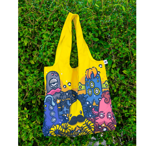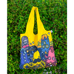 Tas belanja lipat bernuansa kuning cerah yang menampilkan lima karakter Mogus dengan ilustrasi penuh warna dan ekspresi unik khas THE MOGUS.