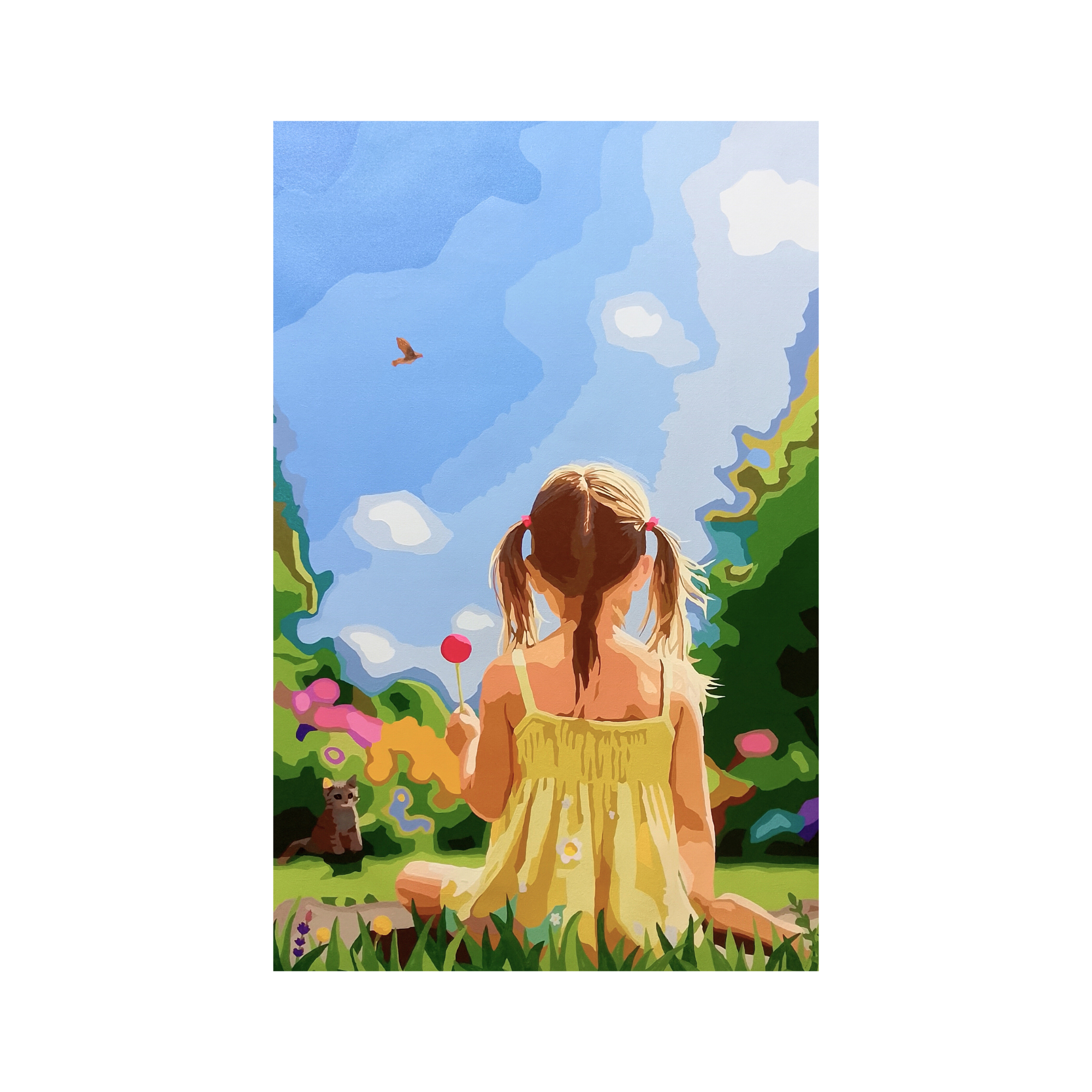 This artwork depicts a little girl in a yellow dress sitting on green grass, holding a red candy and gazing at the blue sky. The scene is filled with colorful flowers and a small cat, symbolizing simple and pure happiness that arises from small things and peaceful harmony with nature. This Contemporary Pop-Realism Art piece by Tri Pandrong is showcased at 2madison, a premier Art Gallery Indonesia dedicated to highlighting the beauty of South East Asia art and high-quality Affordable art Indonesia.